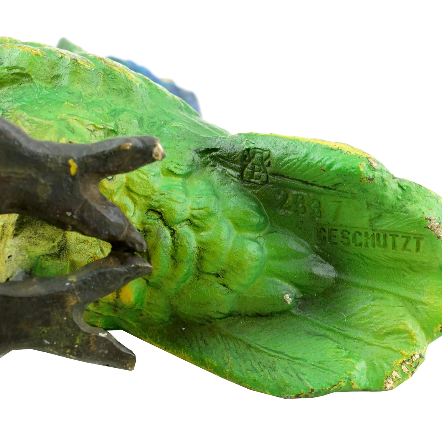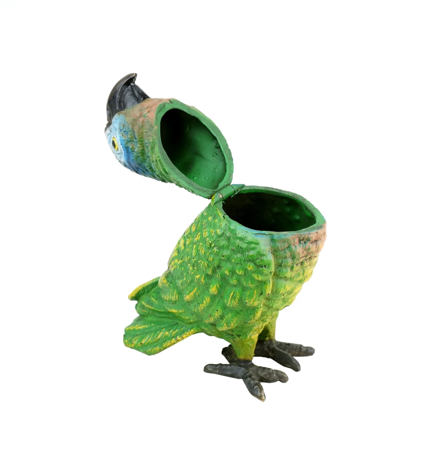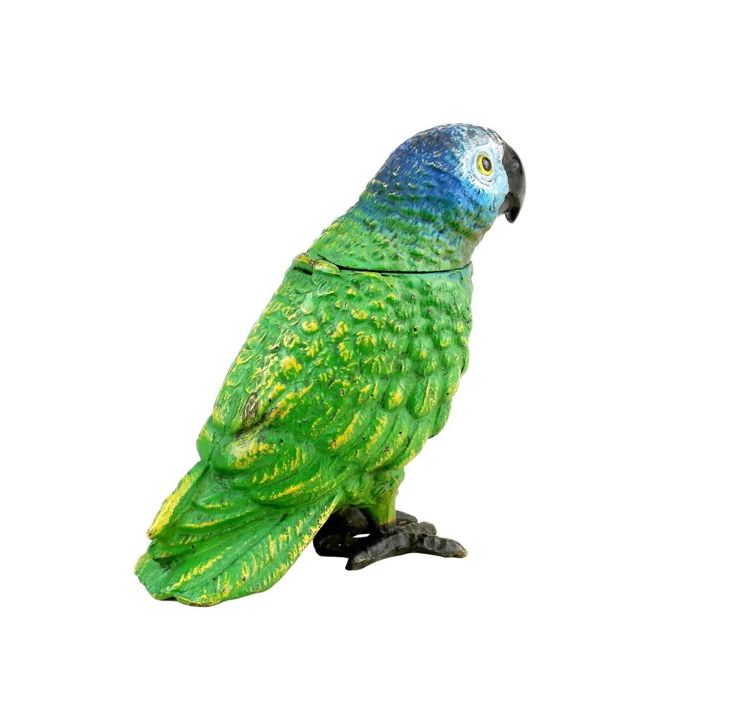 This hand-painted Vienna Bronze parrot is much more than just a decorative bronze animal figurine. The authentically sculpted bird figurine has a technical subtlety, which is quite typical for a piece of art from the Vienna Bronze period. In this case, the head of the stamped bird sculpture can be opened, revealing a small hollow space inside. In the past, this space has been used to store matches. The very lifelike surface structure of this authentic bird figurine is skilfully accentuated by an elaborate painting that was done by hand. The result is a remarkable Vienna Bronze piece that is both decorative and practical at the same time.