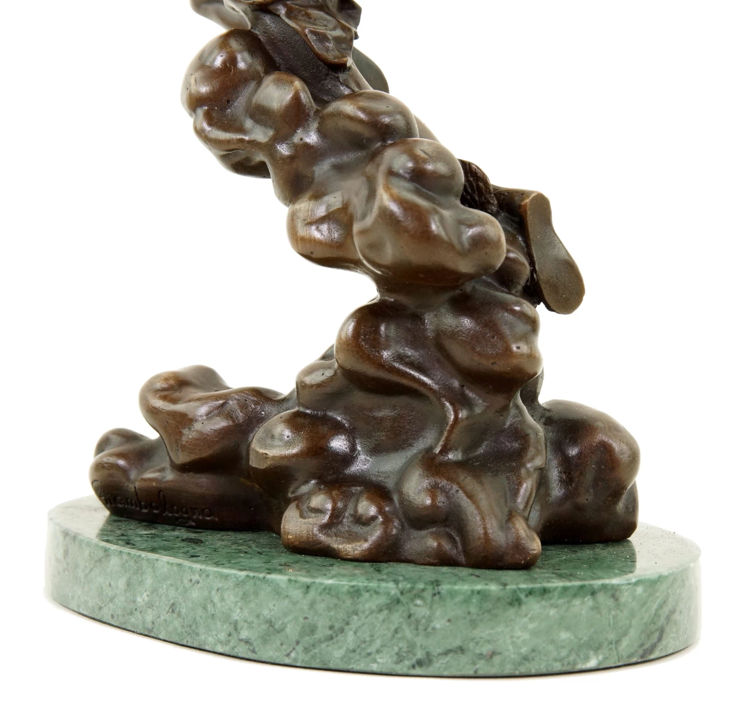 This Greek bronze statue depicts Hermes, messenger of the gods, who seems to be running on clouds, possibly to proclaim an edict of Zeus, the father of the gods. The clouds serve as a transition to the grey marble base on which the detailed bronze statue by Giambologna is placed. In accordance with his mythological role, the character of Hermes carries several of his distinguishing features on him. Thus, the god, who is portrayed as an athletic young man, wears winged shoes on his feet as well as his winged traveller’s hat and his caduceus, which rounds off the decorative motif. There is a discreet name at the statue’s base that gives this mythological sculpture its finishing touch. Additionally, the statue bears the signature of the artist.