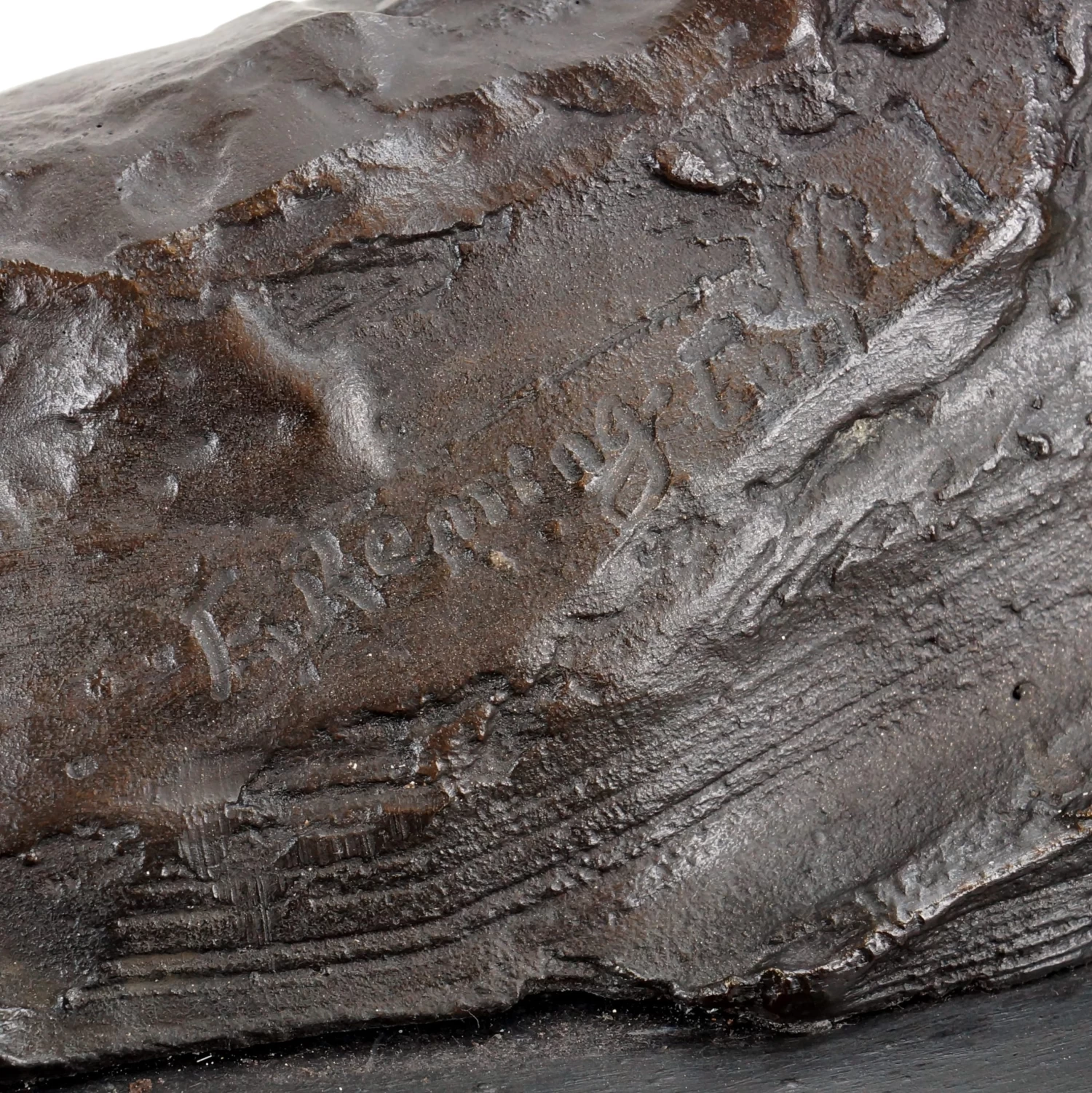 Frederic S. Remington combines virtuoso craftsmanship with abstract modernity in this limited bronze sculpture Indian With Bow. The almost lifelike presentation of the opulent Indian warrior is abstracted due to a cut depiction. The result is a remarkable bronze sculpture which stands out because of its robust static. Only the Indian’s opulent bow works as a connection between the discreet marble base and the bronze figurine. The muscles, facial expression and jewellery of the Indian bronze warrior have been masterfully designed by Remington. This signed Indian sculpture is exclusively limited to 20 pieces and serially numbered.