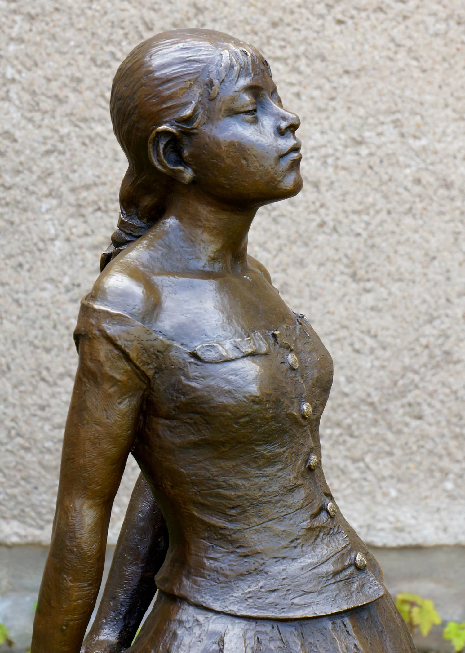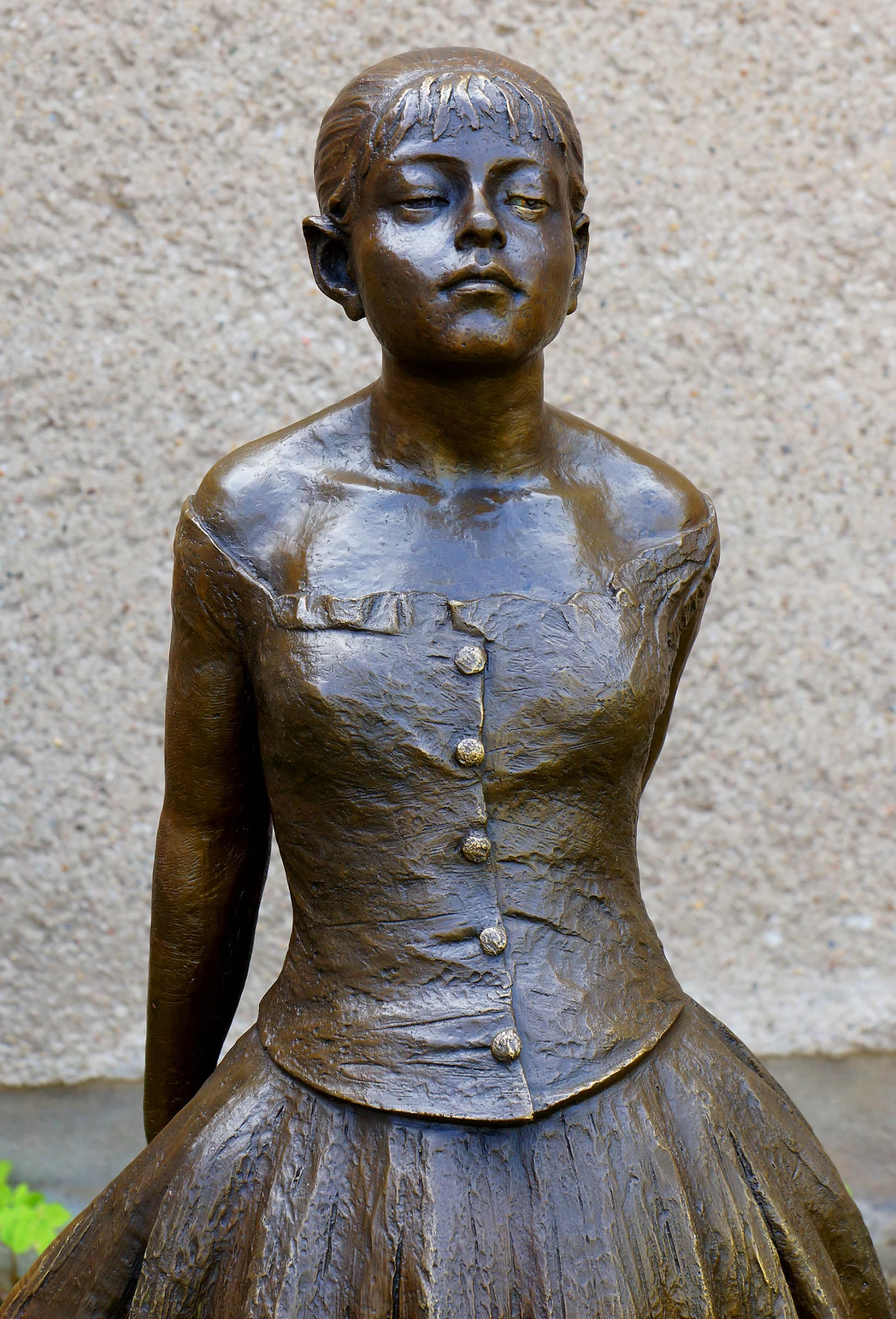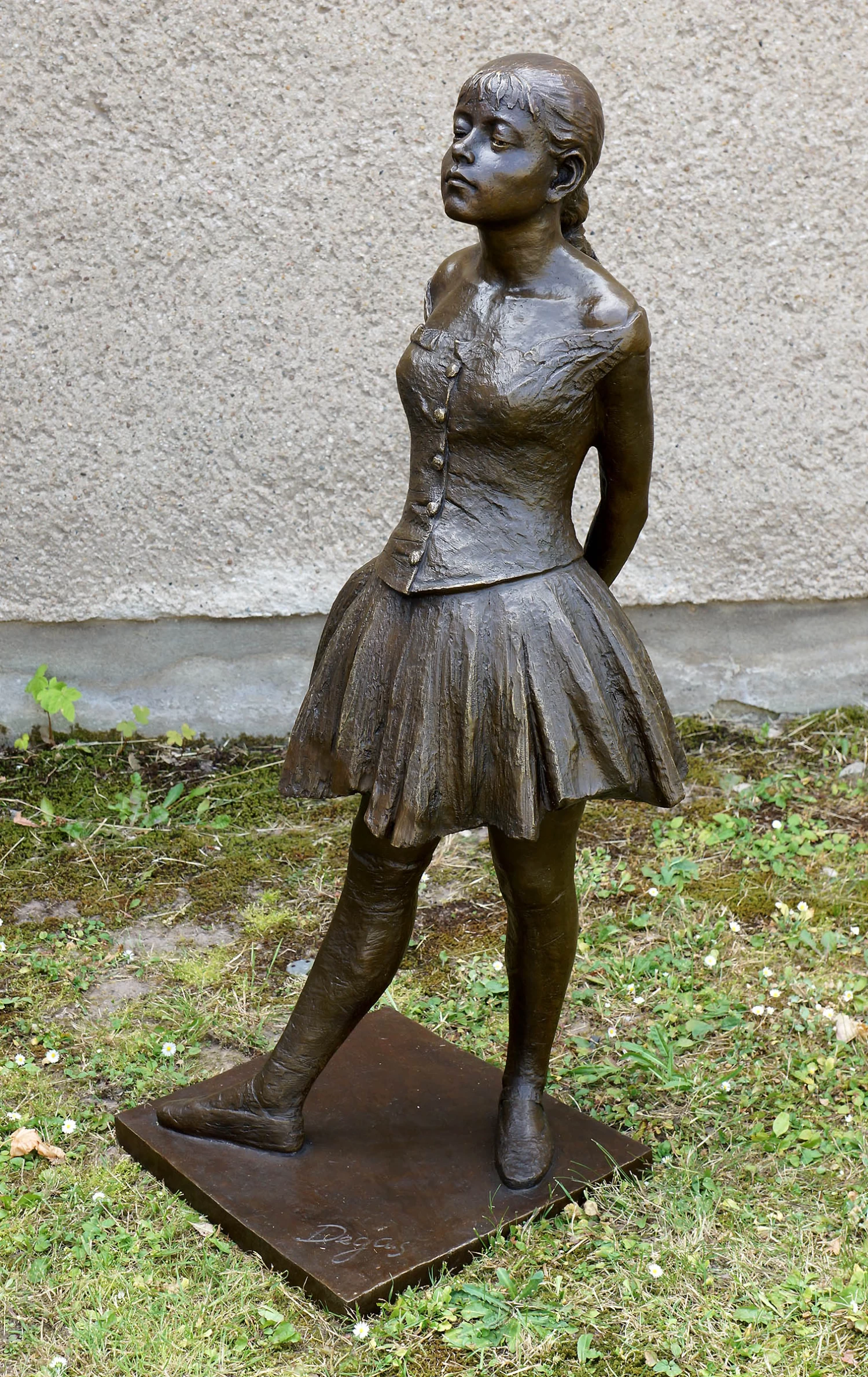 The original of the “Little Dancer of Fourteen Years” (in French: “Petite Danseuse de Quatorze Ans”) stands out for a hyper-realistic representation. Here we see a new form of naturalism: Degas dressed his dancer in real tulle and uses a satin ribbon to bind her hair. The Little Dancer of Fourteen Years is the only work that Degas exhibited in his lifetime. The model for this essentially realistic work is known to have been Marie Van Goethem. Born on June 7, 1865, she was a student at the École de Danse in Paris, and by 1880 she had been engaged as a dancer at the OpĂ©ra. The title, The Little Fourteen-Year-Old Dancer, given to the original mixed-media sculpture when it was exhibited by Degas in the sixth Impressionist exhibition held in Paris in 1881, provides the most solid evidence for the sculpture’s date.