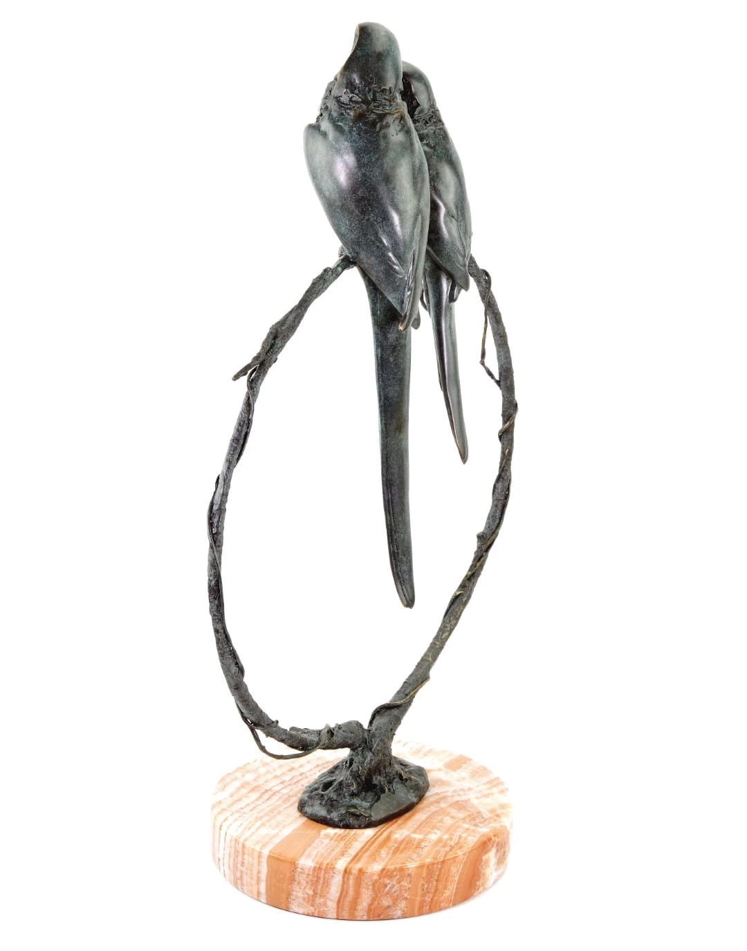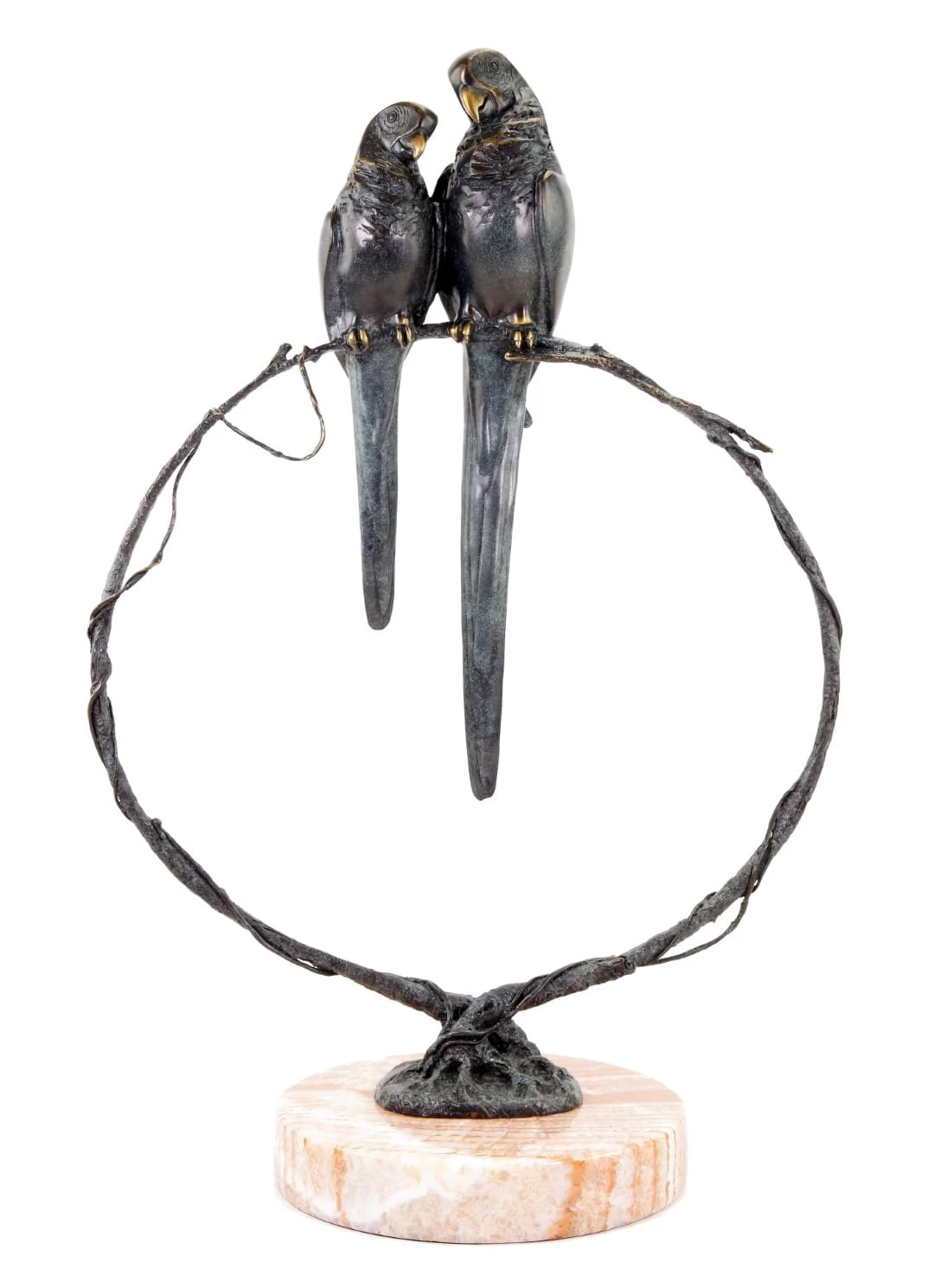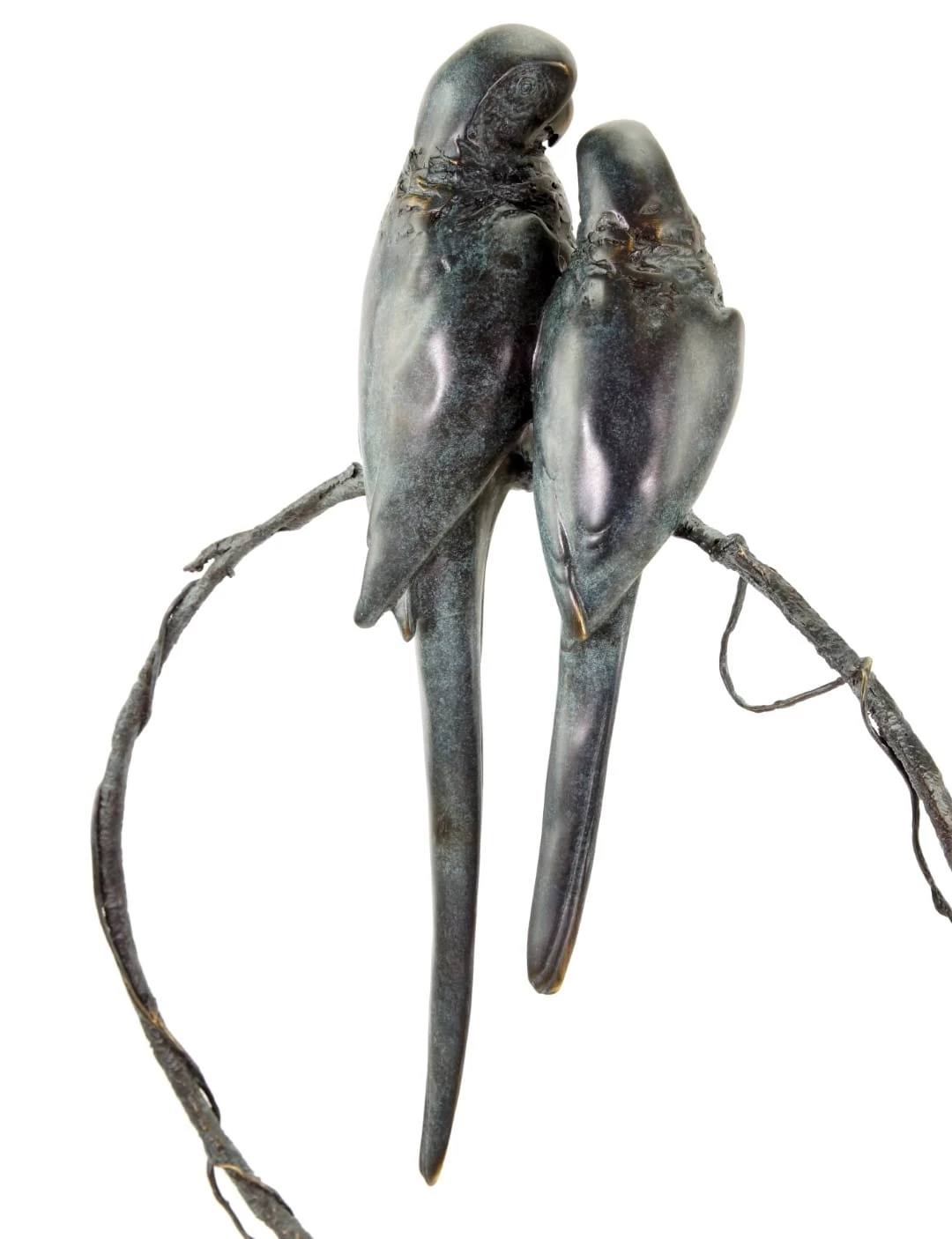 This contemporary animal motif was designed by the object artist Milo and is an absolute gem. It depicts a realistic, handmade pair of parrots that is placed on a ring-shaped branch, which serves as the frame of this contemporary sculpture. A discreet, beige marble base highlights this limited animal sculpture, which is exclusively limited to 20 pieces and serially numbered. The signed bird figurine is particularly accentuated by its colour scheme, which highlights the bronze parrots next to the green patina thanks to several polishings. The limited bronze statue is also interesting when it comes to its shape and colour scheme, making it a definite eye-catcher in any room. The contemporary sculpture is defined by its exotic vibrancy, its complex design and, finally, its resulting decorative overall effect.