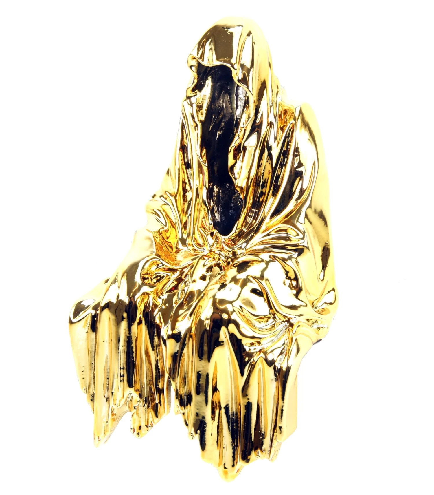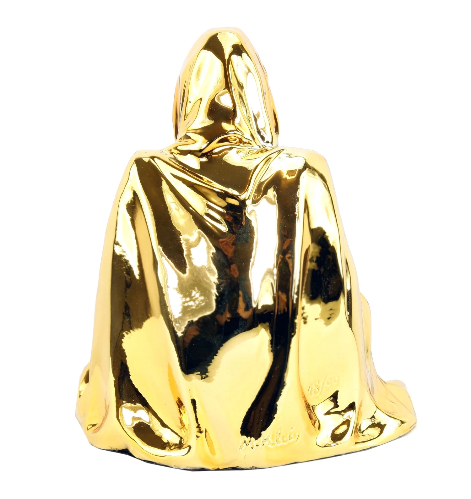 This mystical bronze statue can be seated in any setting and presents a unique decorative element – provided that there is a ridge available. This limited bronze statue is a so-called shelf sitter that can simply be put on various items of furniture. The bronze figurine depicts a ghostly figure with long flowing robes. And exactly those robes are the reason why this shelf sitter is so interesting. Several highs and lows in the motif highlight the ductile effect of this mystical gothic figurine. The robe seems to cling to any edge on which the sculpture is placed, which furthermore accentuates the gloomy effect of the statue. This mystical shelf sitter figurine is exclusively available in two different colours. This shelf sitter is the gold version, which has been galvanically refined with an elaborate colouration in glossy gold. This bronze shelf sitter Ghost is exclusively limited to 20 pieces and serially numbered. Additionally, the bronze statue bears the signature of the artist.