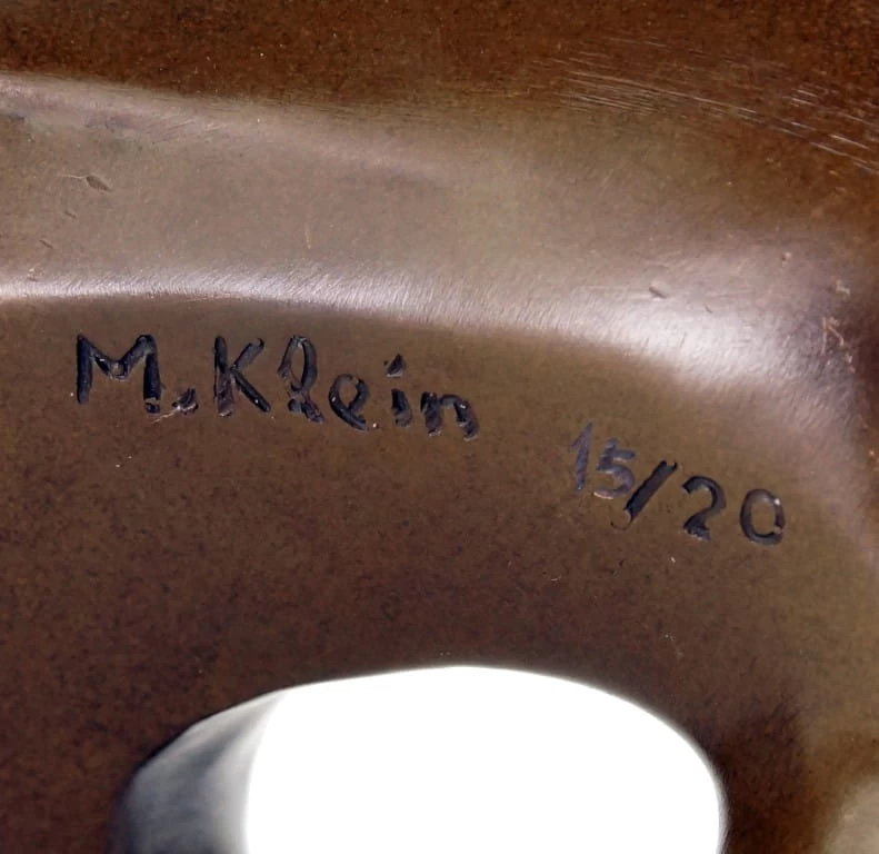 Modern, reduced, decorative. This free-standing bronze bull sculpture by artist Martin Klein finds exactly the right balance between abstraction and real design. The sculpture depicts a bull, which is characterised by reduced, flowing forms. The rough sculpture made of 100% bronze is exclusively limited to 20 pieces and consecutively numbered. The abstract animal figure looks extremely massive and can nevertheless be placed flexibly. It finds an effective place on an office desk as well as on a shelf, sideboard, or cupboard. The imposing bronze bull figure was finally refined by polishing the symbolic horns. The limited-edition bronze sculpture also bears the artist’s signature.