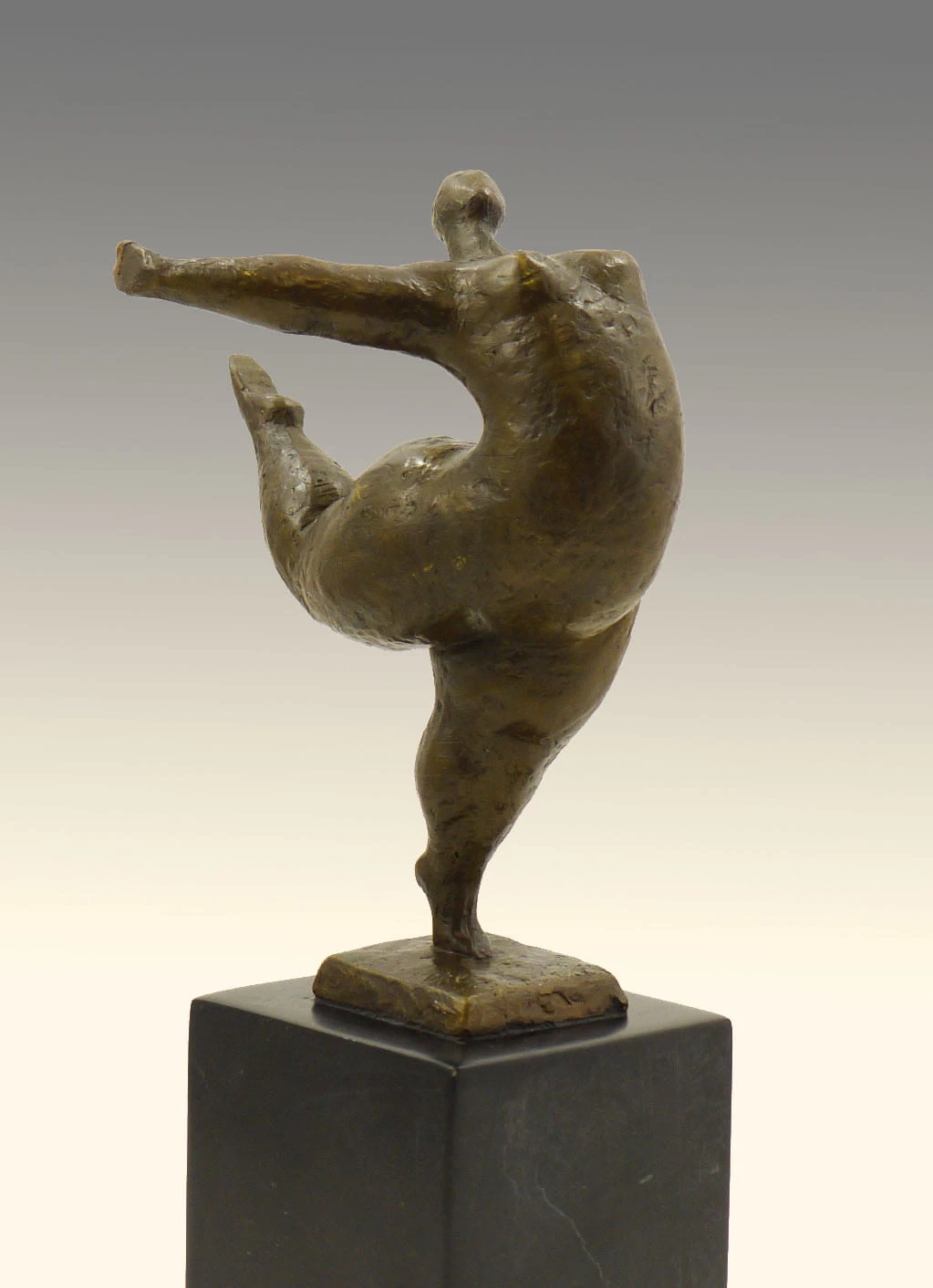 “Chubby Female Dancer” is the title of this Modern Art sculpture, that was created by Milo and his great imaginativeness. The handmade sculpture, which consists of 100% bronze, shows an anonymous, abstract and corpulent female dancer, who draws attention to herself, showing elegantly her voluminous body. The proportions of the nude sculpture remind of the works of Rubens and stress the beauty of a corpulent body in an aesthetic way. The sportive dance style of the female dancer reminds of the perfect acrobatic skills of a gymnast. Elegantly the chubby dancer balances on one foot, stretching her left leg backwards. Milo made with this impressive bronze figure a symbol of anonymous beauty. It is set on a square shaped plinth of dark marble and consists of 100% finest bronze. The “Chubby Female Dancer” is signed by Milo at the small bronze plate, on which the dancer stands.