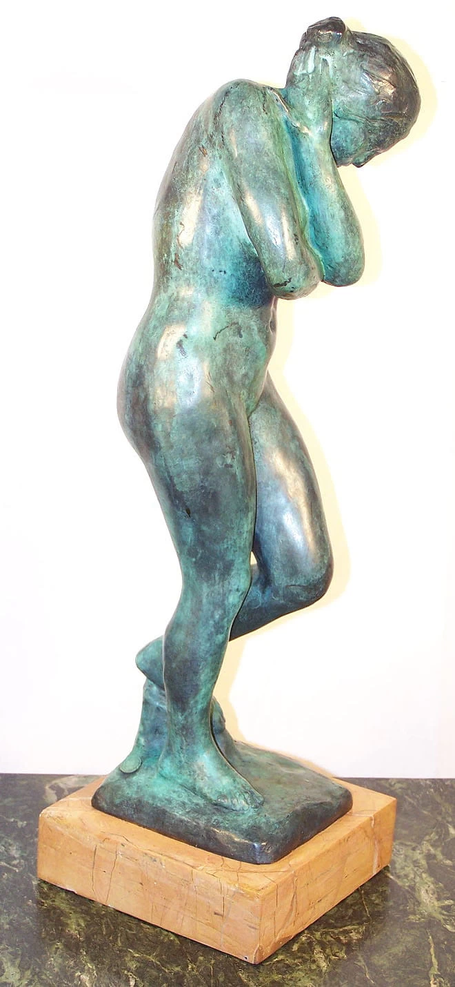 “Shades of Eve” is a beautiful modern art sculpture created by the great sculptor Auguste Rodin. The figure is the image of a well shaped woman in standing position while her head looks down. She seems to protect herself with her left hand she is holding close up to her neck. The figure made of 100% finest bronze is stunning modern art made by Auguste Rodin. The nude female is coloured with a greenish patina and affixed on a light brown marble-base. The sculpture of Eve, the female partner of Adam, is signed with “Rodin” and was casted in a stunning agreement to the original made by Auguste Rodin.
