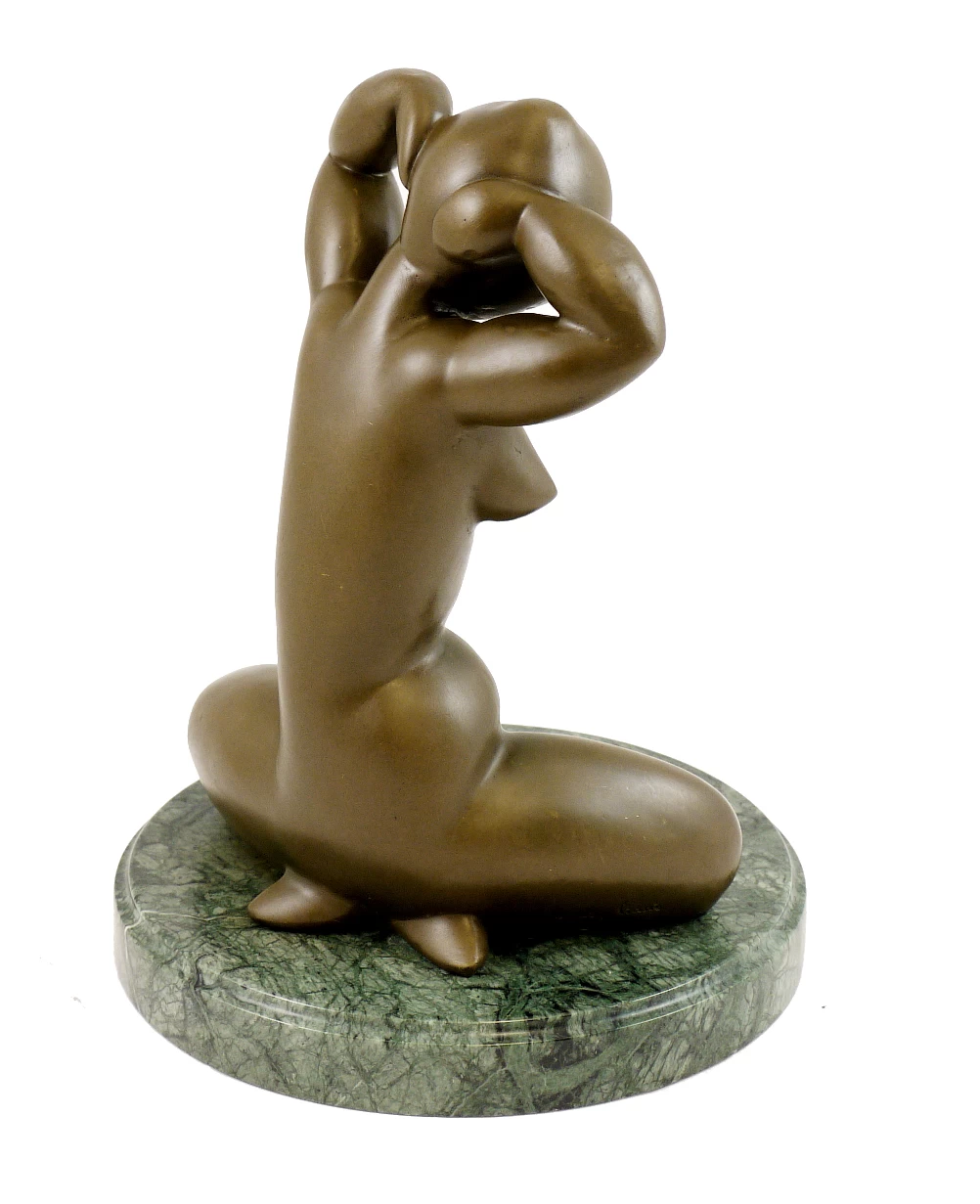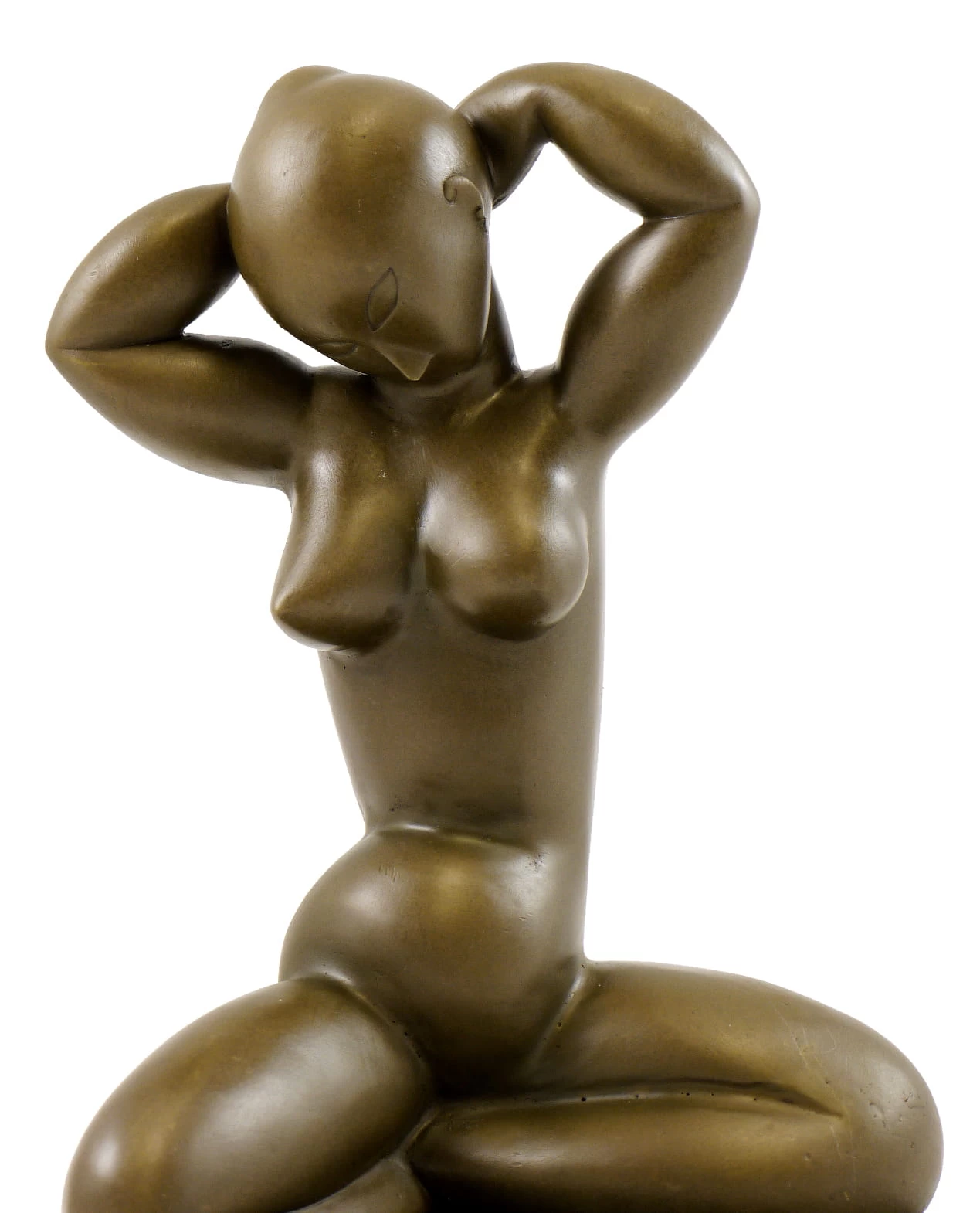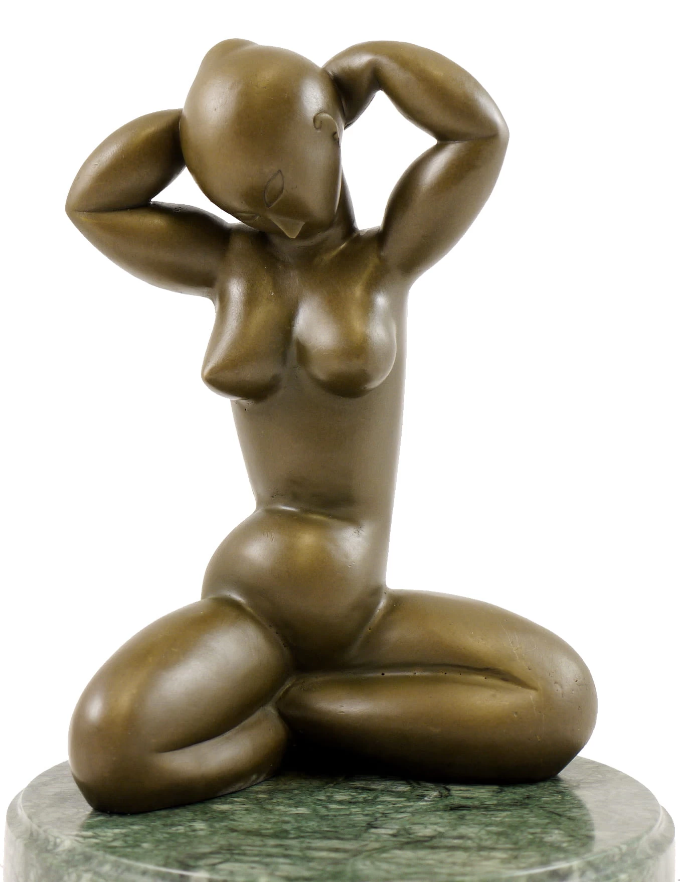 The „Karyatide“ is based on a draft by Amedeo Modigliani, which was originated between the years 1913 and 1915. The concept comes from the architecture and describes sculptures, which replaces pillars of a building. In this sense these figures shall carry a load and Amedeo Modigliani transfers this meaning on his female nude. From 1910 to 1913 he used this theme again and again for his paintings and sculptures. The figure, which was made of 100 percent bronze, seems on one side dynamically and on other side statically. This tension between liberty and obligation, something to do, is expressed in this motif. Elongated forms belong to the typical characteristics of Amedeo Modigliani, whose signature is to see on the bronze figure. A flat marble base provides the sculpture with the necessary stability.