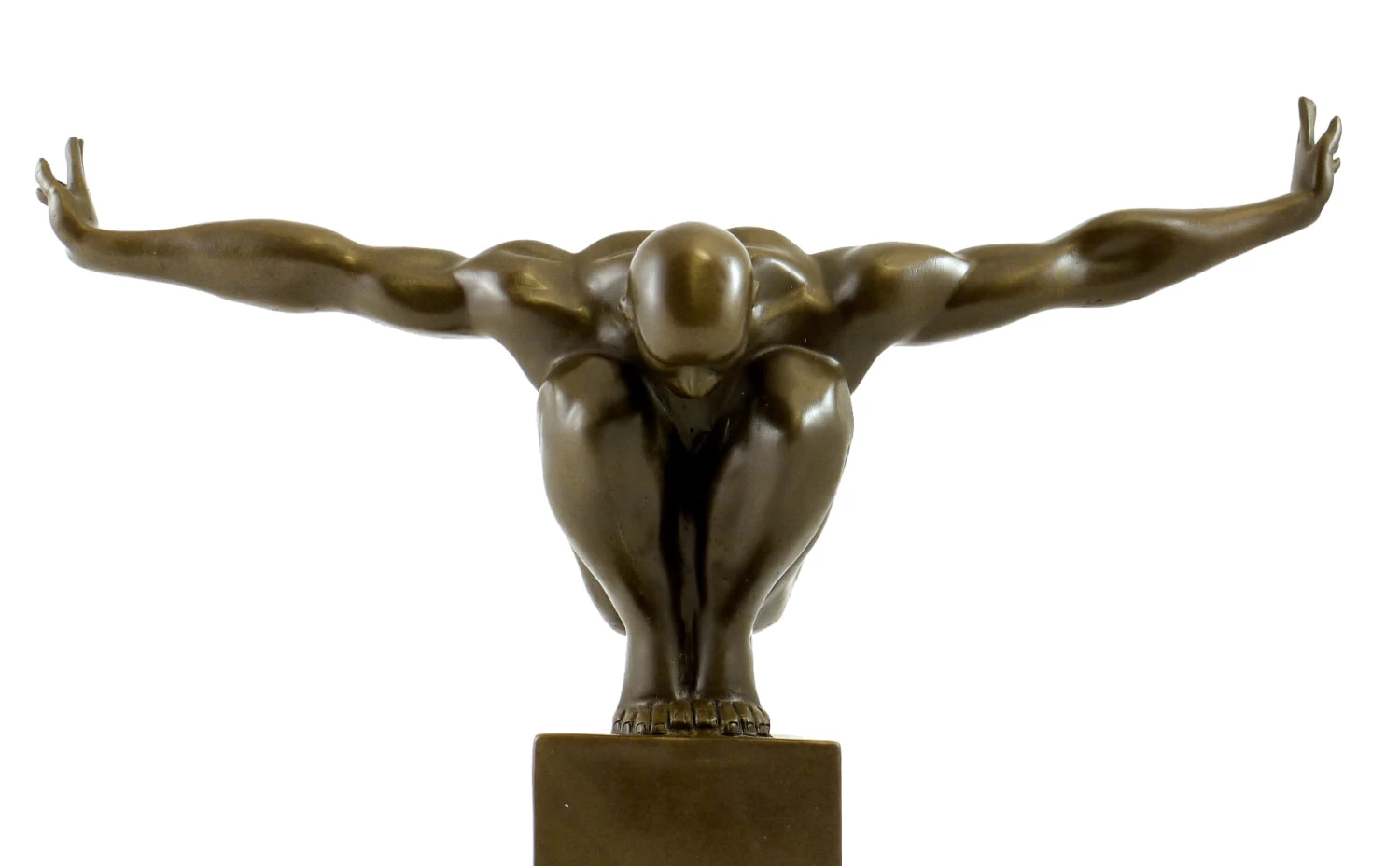 The bronze sculpture „The Athlete“ by Milo originates from a diverse and popular using of this motif. The figure shows a sportsman, whose muscles were extremely detailed elaborated. In crouching position he finds the right stance for concentrating. The shining glance of bronze highlights the contours of the art object and the strands of muscles of the athlete. The arms are stretched and the fingers are lightly spread to the top. In this position the sportsman wants to find his internal ease to perform records with all strengths. This figure was made of 100 per cent finest bronze.
