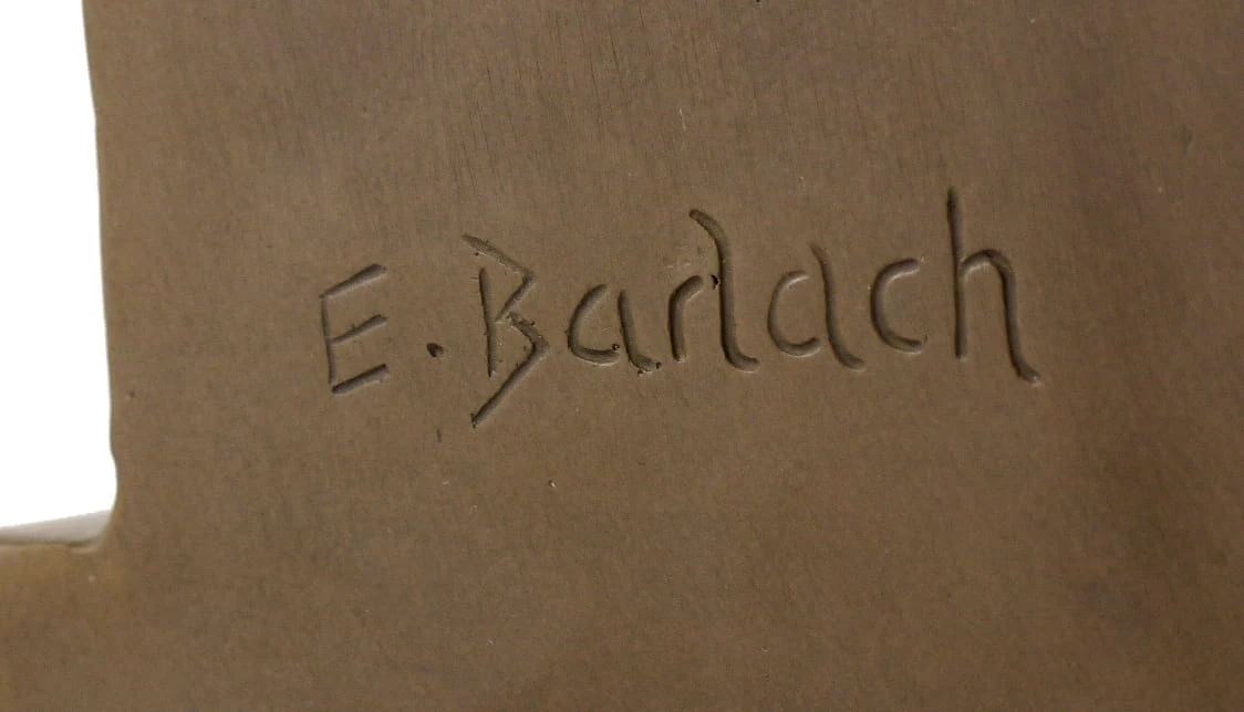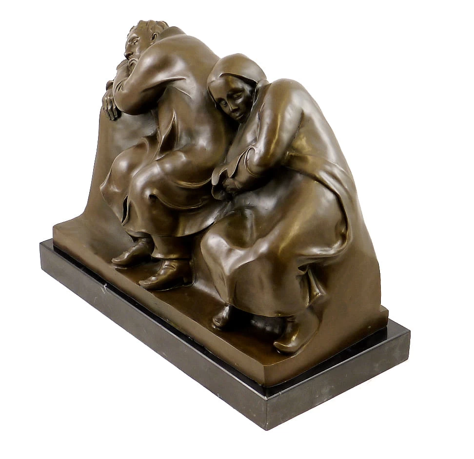 The bronze sculpture „Sleeping Drifters“ by Ernst Barlach is widespread as motif. The model for this figure was created in the year 1912. A woman and a man sit or lie on a bench, the clothes of this couple are good to spot. Folds and wraps are fine elaborated. Both persons are exhausted, they sit down and sleep. The wife leans on her husband and so she finds hold to rest. The strained facial features show, that these persons have to work very hard. This bronze sculpture has a signature of Ernst Barlach.