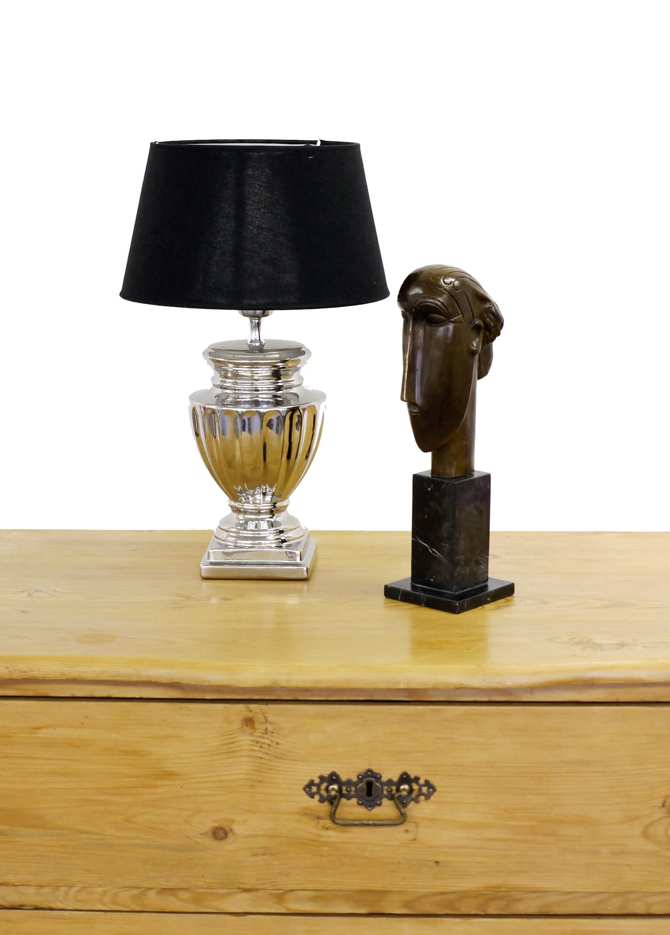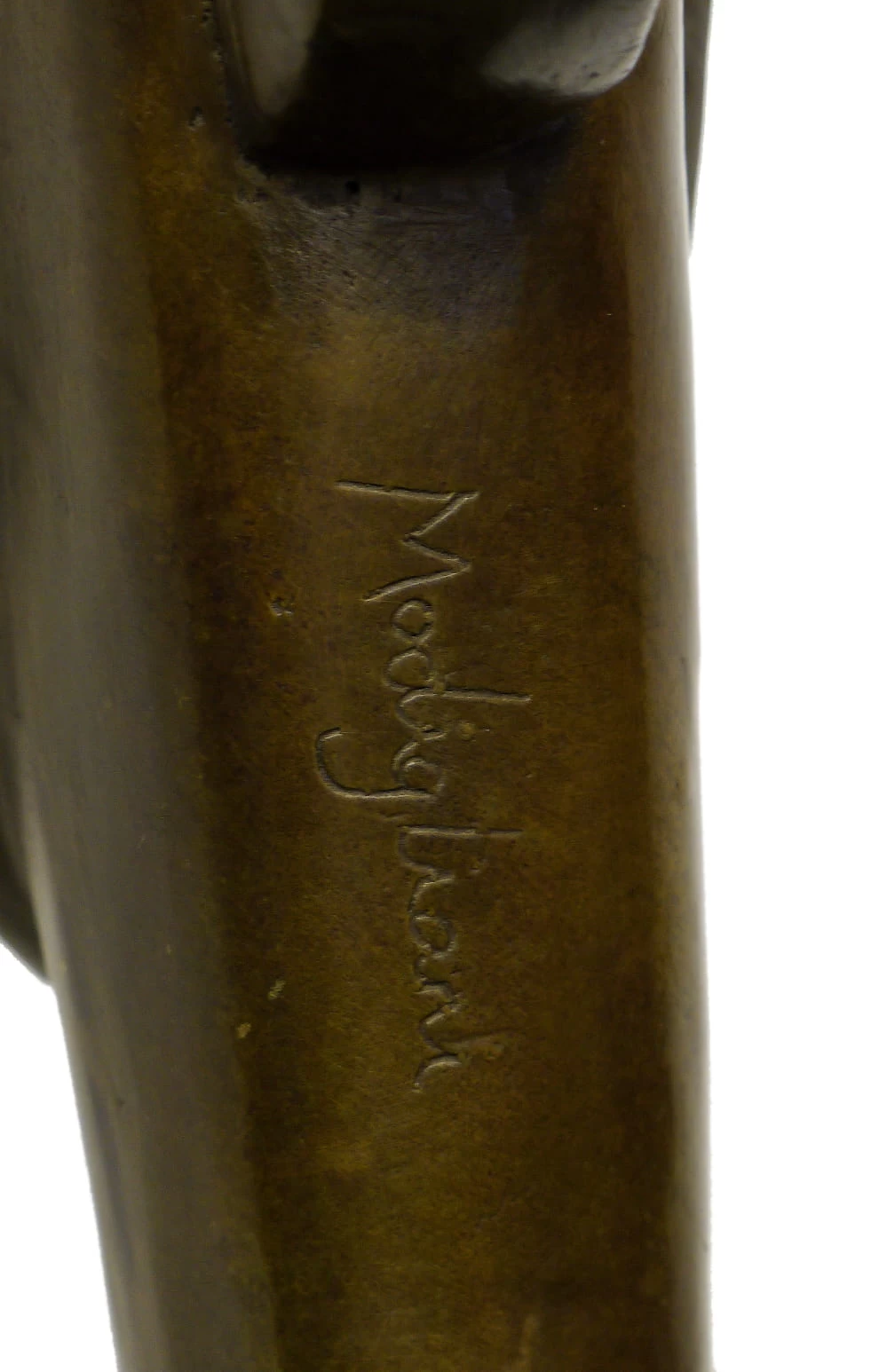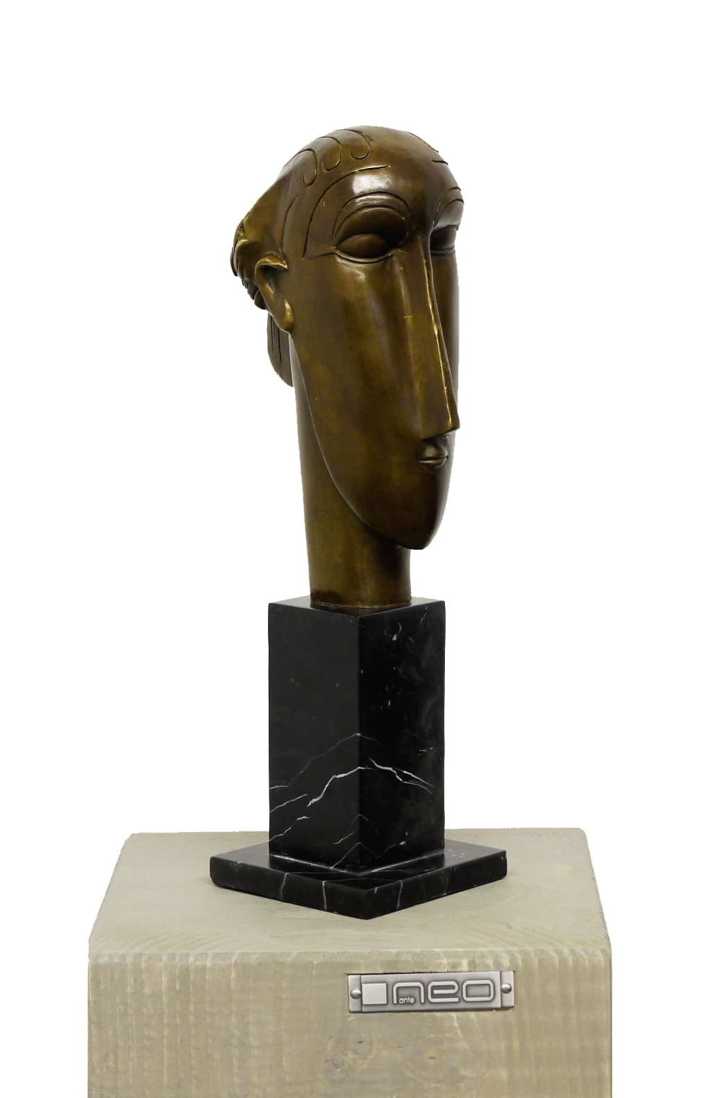 The modern sculpture “Woman’s Head” was created by the Italian artist Amedeo Modigliani (* July 12, 1884; †January 24, 1920) in 1912. While the original sculpture of “Woman’s Head” was made of stone this recast was made of 100% finest bronze. And while the original is nowadays exhibited at the Metropolitan Museum of Art in New York this exhibit can be exhibited everywhere, like inside the living room or even at an office. The sculpture was affixed on a base of marble. “Woman’s Head” is a sculpture with a very noble and majestic touch. The pure design of the sculpture is a typical characteristic of all sculptures made by Modigliani. For the perfect finish the modern sculpture “Woman’s Head” was signed with “Modigliani”.