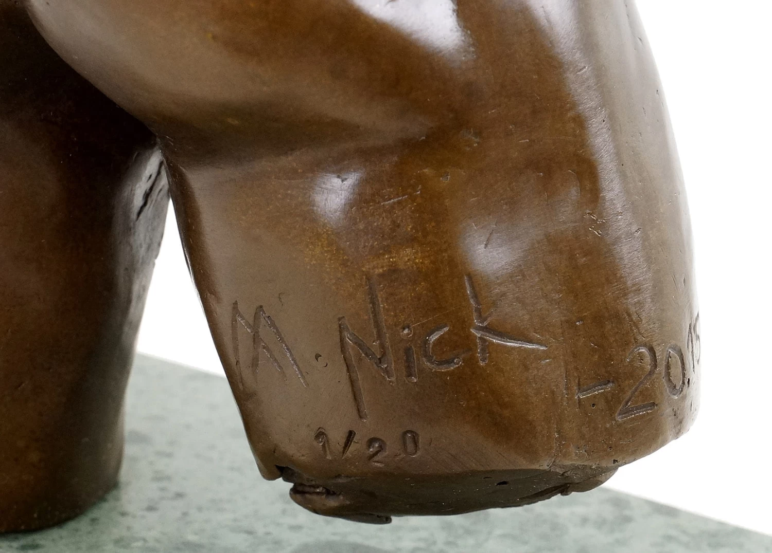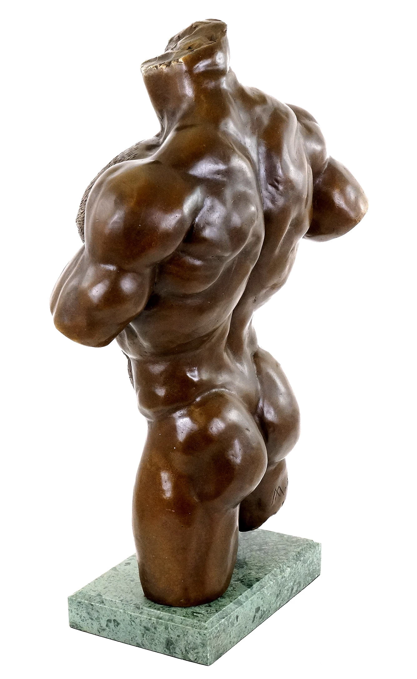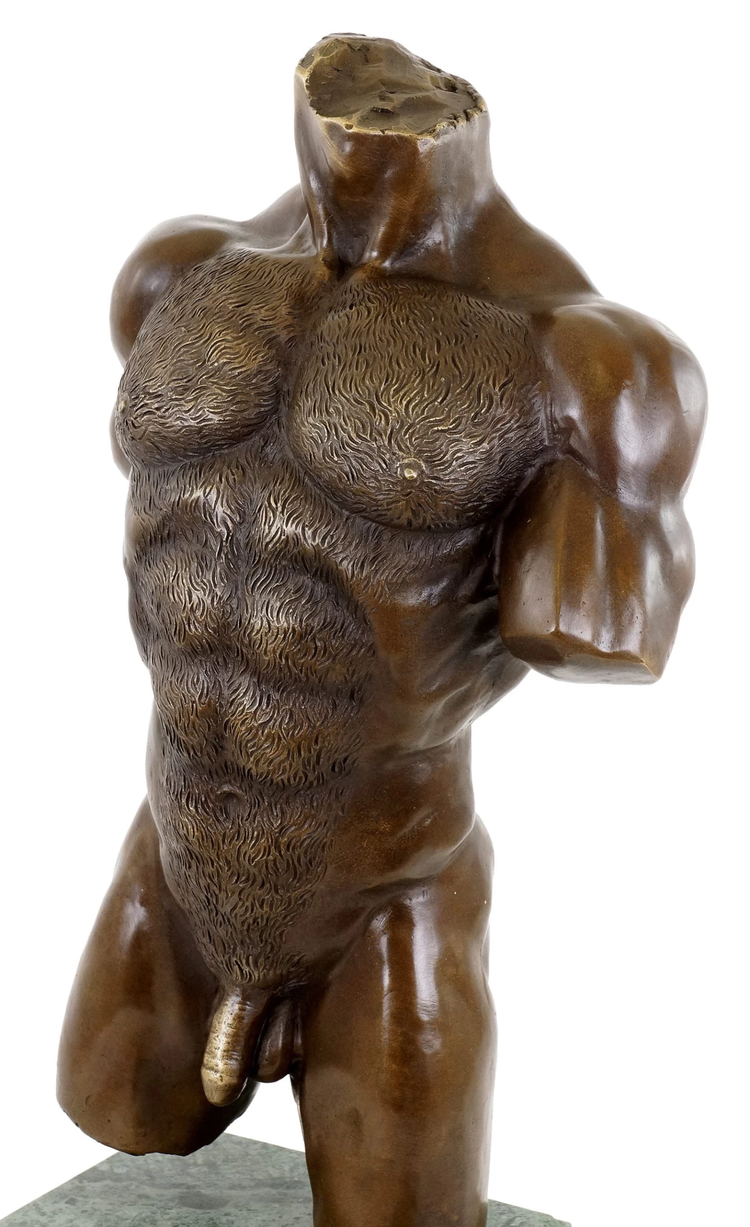 This erotic statue of a male torso represents the ideal of a male body. Reduced to the upper body and lower abdomen, this erotic nude focuses on the most manly attributes. The opulent hairiness and the remarkably defined muscles perfectly depict a male body with a healthy testosterone balance. The well-trained body with its elaborately sculpted penis conforms to the contemporary ideal of beauty. The sculpture is decorative and a guaranteed eye-catcher. Let yourself be inspired by this perfect depiction of a man. The solid bronze sculpture stands on a green marble base and carries the signature of French artist M. Nick. This bronze erotic nude is limited to 20 pieces.