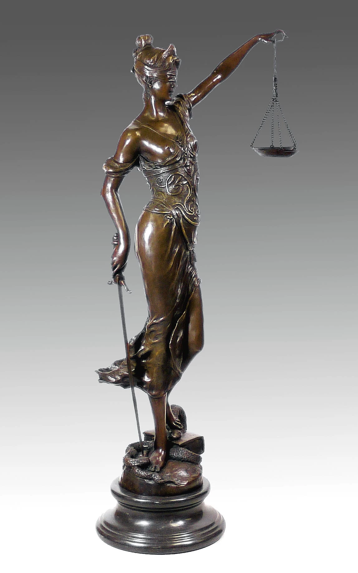 This highly impressive and legendary sculpture is from the age of the Roman Mythology and shows the famous “Lady Justice”. “Lady Justice” is displayed as a woman with a scale and a sword; all time ready to judge about law and unjustness. This is a wonderful bronze sculptur as an exclusive ambience and would certainly make a great impression in a lawyers office. This is a famous classic bronze item of a roman legend, standing on a little round marble-base and finest quality is the basis to produce this beautiful mystic object. In comparison with the original, this sculpture is as filigree as possible and it was made to be used as exhibitiion item or cllectors of mythic figures. Our own production control assures the top quality of this beautiful bronze.