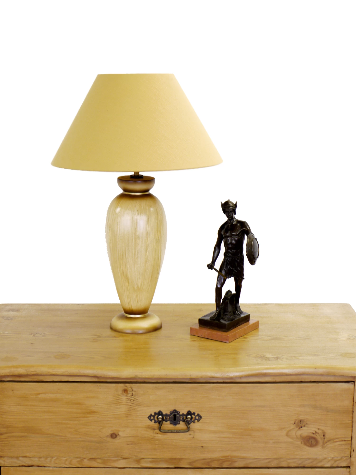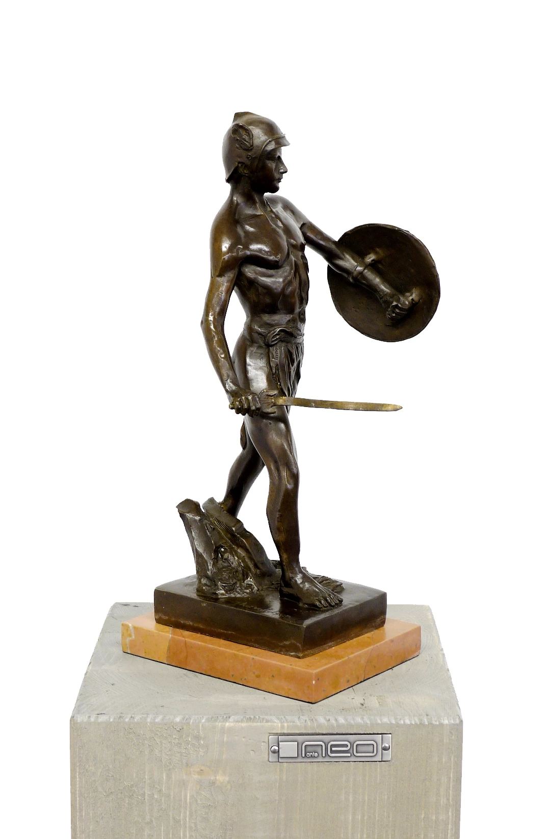 The attractive mythology sculpture “Warrior” was made after a cast of the sculptor Bertel Thorvaldsen (* November 19, 1770 in Copenhagen; March 23, ibidem), a well known sculptor from Denmark. “Warrior” is an exclusive bronze figure of a well trained roman warrior with weapons but only wearing a loincloth.The equipment as well as the whole bronze is designed very filigree and with many details. The strong warrior with an expressive facial expression was made of 100% finest bronze and affixed on a solid base made of lightly coloured marble. Furthermore the mythology sculpture was signed with the signature of the artist B. Thorvaldsen. All in all, the exhibit is a perfect image with filigree details and a real high class product.
