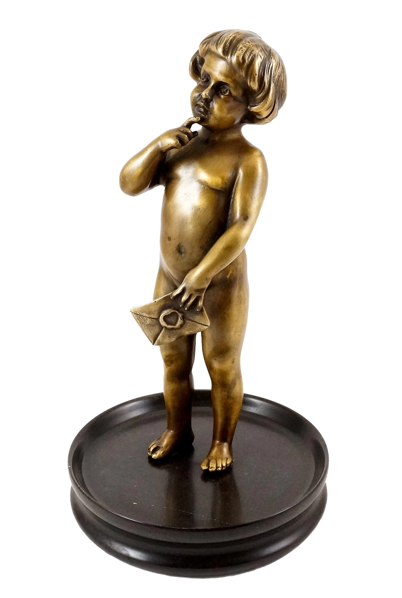 Vienna bronzes are famous and distinguished by their naturalistic and detailed representation of human figures. The “nudie” on the left is holding an envelope in his hand and looking thoughtfully skywards. The figure itself is mounted on a versatile marble bowl, in which business cards, notes, paper clips, and much more can be stored or can even be used as a noble ashtray. The sculpture is hallmarked with the stamp of the Bergmann foundry.