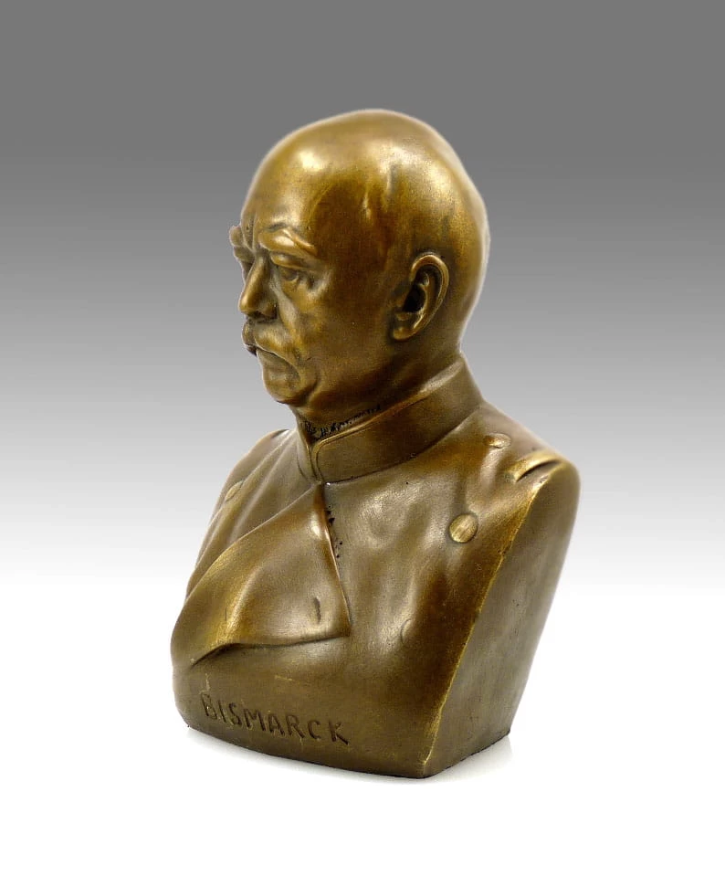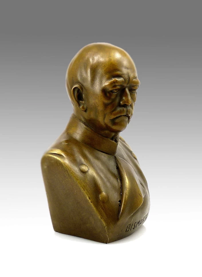 This relatively plain Military bronze bust of the well-known German Reich Chancellor Otto von Bismarck was cast in the famous foundry of Hermann Gladenbeck in Berlin and is, of course, signed by this renowned founder. The bust is made of 100% bronze and mirrors Otto von Bismarck’s facial lines perfectly, even though it is not very detailed. It is a must-have for lovers of history and political figures. It emits strength, power and intelligence, so that the sculpture is surrounded by an atmosphere of nostalgia and majesty.
