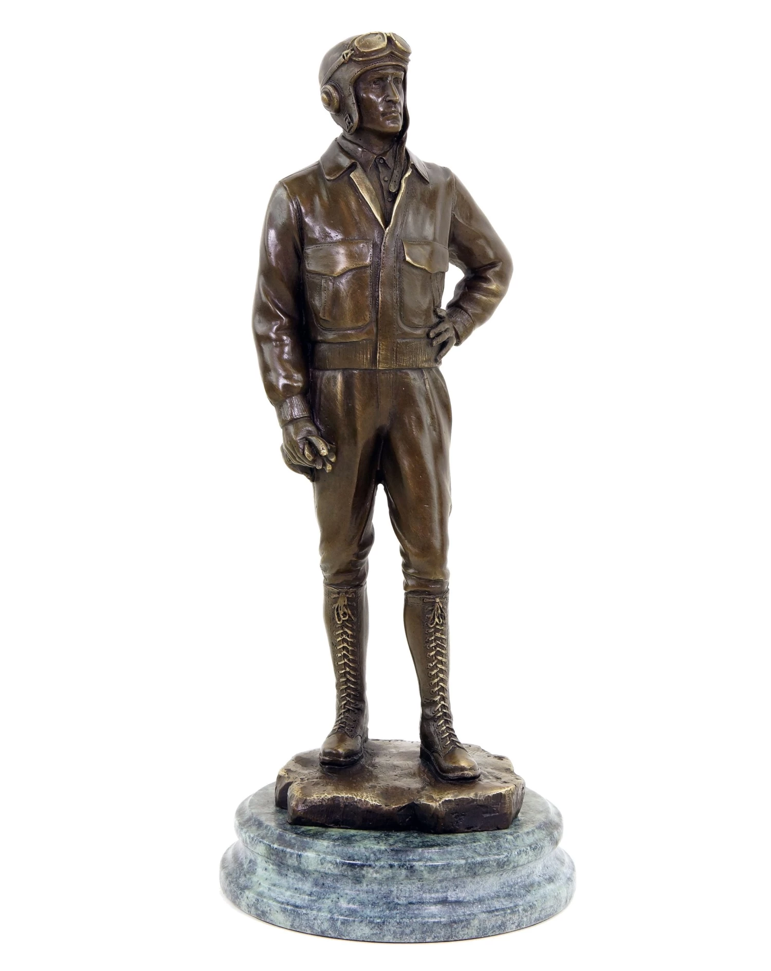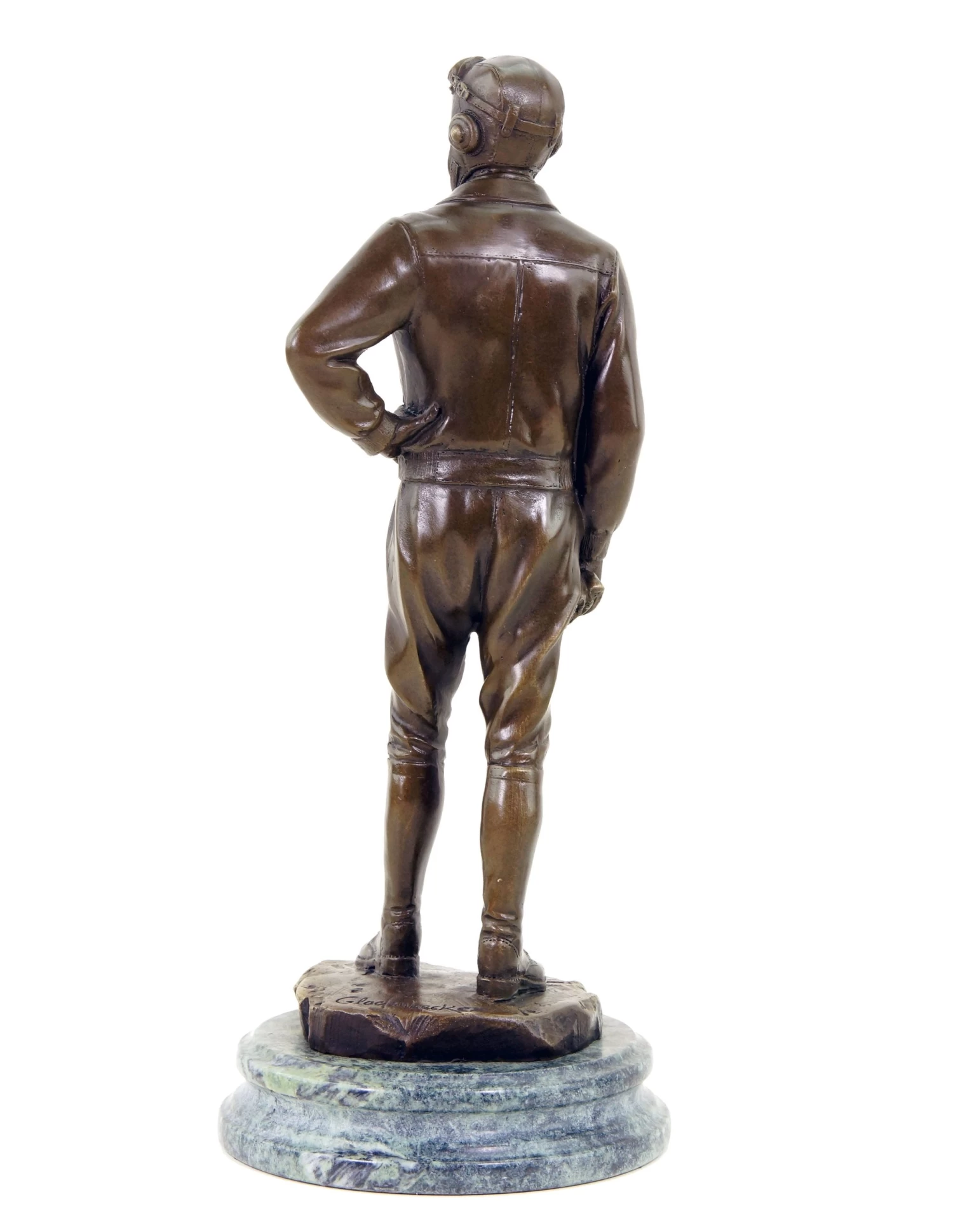 This historically inspired aircraft statue from the First World War shows the authentic figure of a pilot in a vintage style. Placed on a green marble base, this decorative aircraft statue depicts a young man in classic pilot equipment who strikes a confident pose. With a closer look to his equipment, the central attributes of his clothing become apparent. On his feet, the young pilot wears high lace flyer’s boots that almost reach his knees. He also wears a classic full length suit with large pockets on his breast, gloves in his right hand and an aviator’s cap that rounds off this motif. The different materials that are depicted in the motif are sculpted in a very lifelike manner. The pilot figurine bears the signature of the artist and manages to capture a historic background into a decorative design.