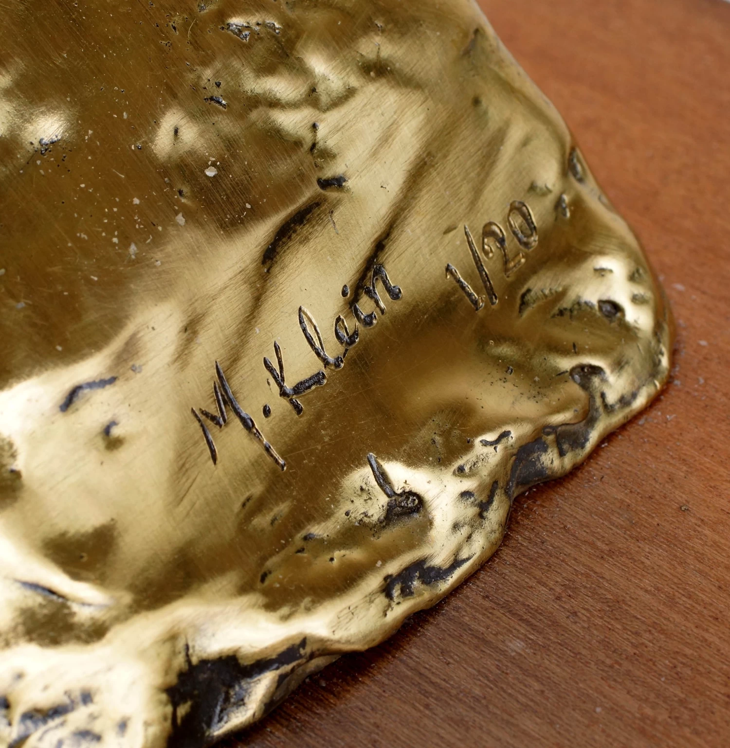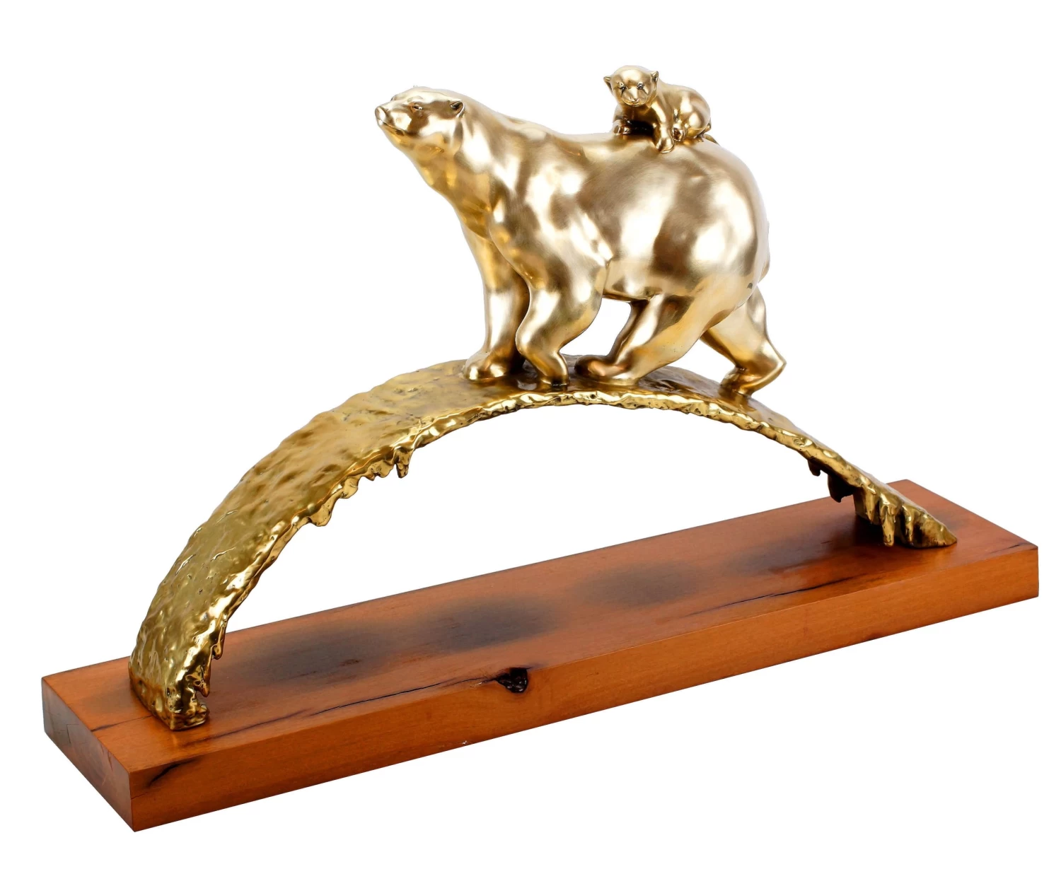 Placed on a base made of refurbished ship’s plank, this decorative bronze sculpture by Martin Klein of an impressive polar bear is a guaranteed eyecatcher in any surrounding due to both its shape and coloration. This polar bear sculpture is exclusively limited to 20 pieces and is characterised by the natural portrayal of the two polar bears, whose shape and dynamic pose could not be any more realistic. Martin Klein abstracts this natural portrayal by placing both polar bears on a half ellipsis that is partially covered in icicles and thus subtly hints at their natural habitat. Finally, the bronze sculpture Polar Bear with Baby is abstracted due to the golden overall image of the animal figurine, which creates flowing transitions and turns the bronze sculpture into a decorative piece of contemporary art.