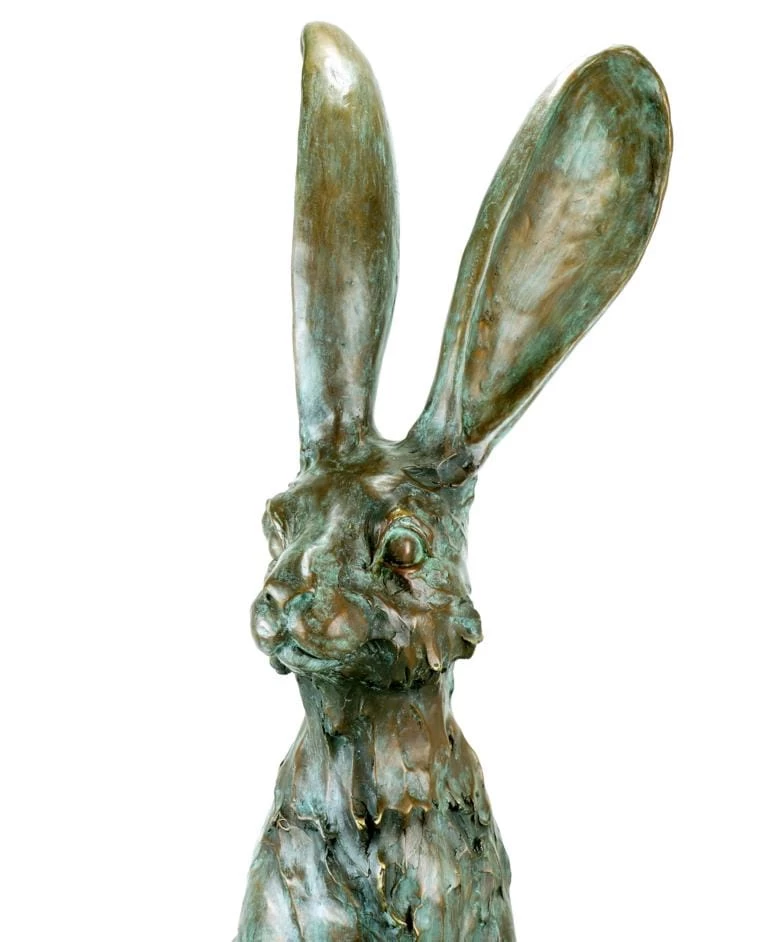 This opulent bronze sculpture by Martin Klein depicts a naturally designed XXL Rabbit which is partially patinated in green. This big bronze is exclusively limited and serially numbered. The contemporary rabbit sculpture has a detailed surface design, which makes this fascinating decorative rabbit a real eye-catcher both in rooms and gardens. Bronze sculptures are extremely weather-proof, thus they only develop their unique patina over time. Due to its timeless nature, its size and its material quality, this rabbit figurine is the perfect decorative garden statue.