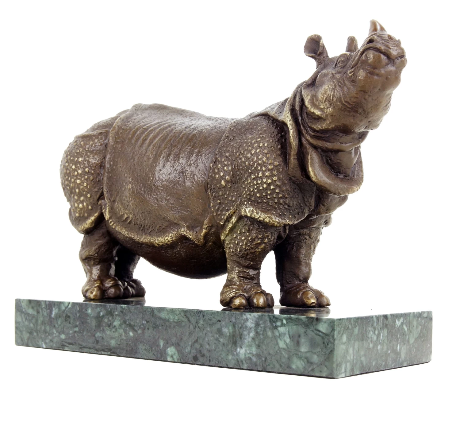 This contemporary animal sculpture by Italian sculptor Rembrandt Bugatti depicts an Indian rhinoceros. Positioned on a discreet green marble base, the exotic animal figurine that is made from 100% bronze is characterised by a highly authentic design, reaching from its natural proportions to a detailed surface design. Partial polishings of the bronze material help to skilfully accentuate certain parts of this contemporary sculpture. The naturally massive form of the Indian rhinoceros combined with the delicate sculpting of Bugatti turn the sculpture into an impressive and realistic contemporary bronze statue.