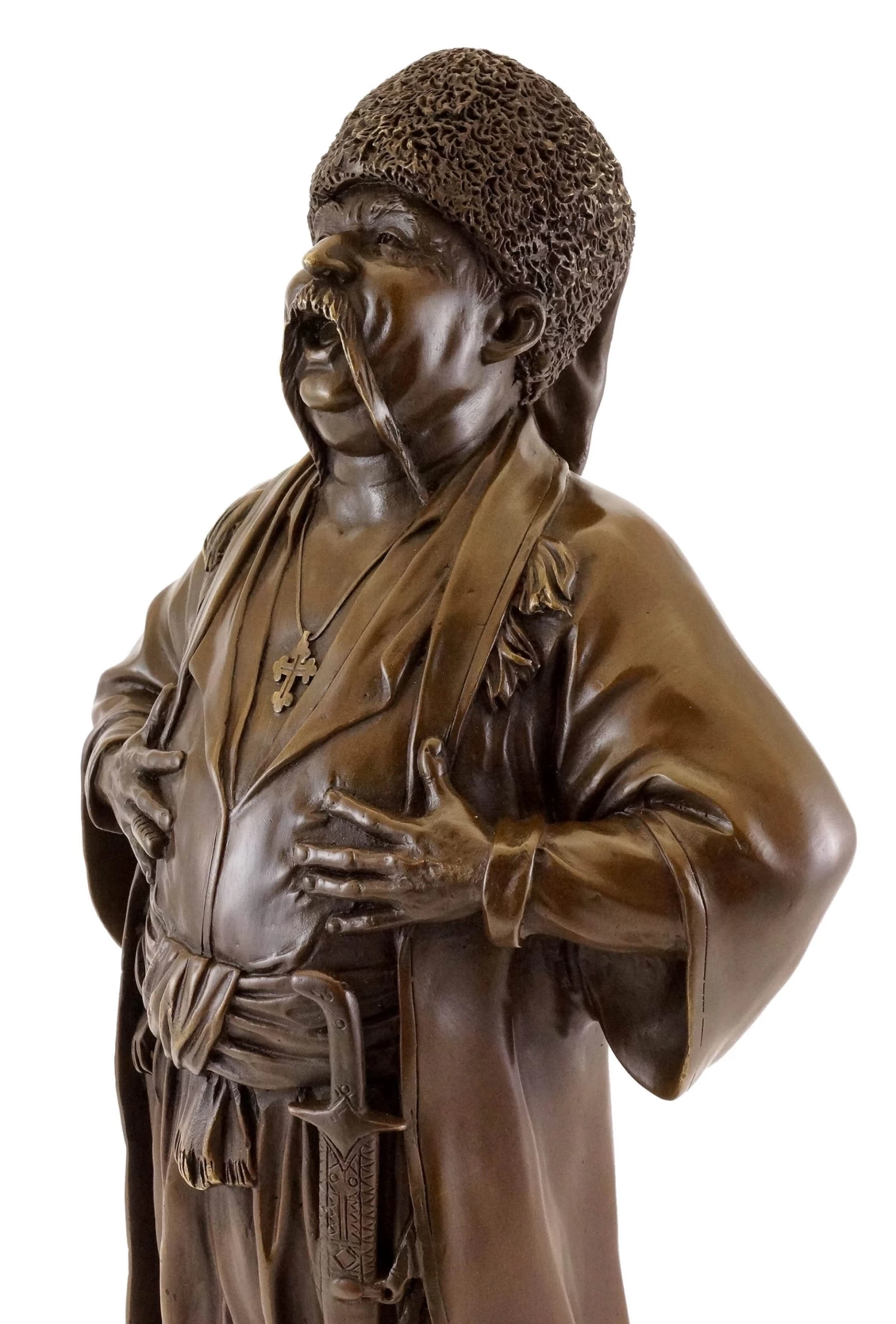 The original of this Cossack was designed by Eugene Lanceray (Yevgeny Yevgenyevich Lansere). Cossacks are characterized by an extraordinary vivacity and cheerfulness. Cossacks are a group of predominantly East Slavic people who became known as members of democratic, semi-military communities, predominantly located in Ukraine and in Southern Russia. They inhabited sparsely populated areas and islands in the lower Dnieper, Don, Terek, and Ural river basins and played an important role in the historical and cultural development of both Russia and Ukraine. The sculpture on the left is signed with “E. Lanceray”.