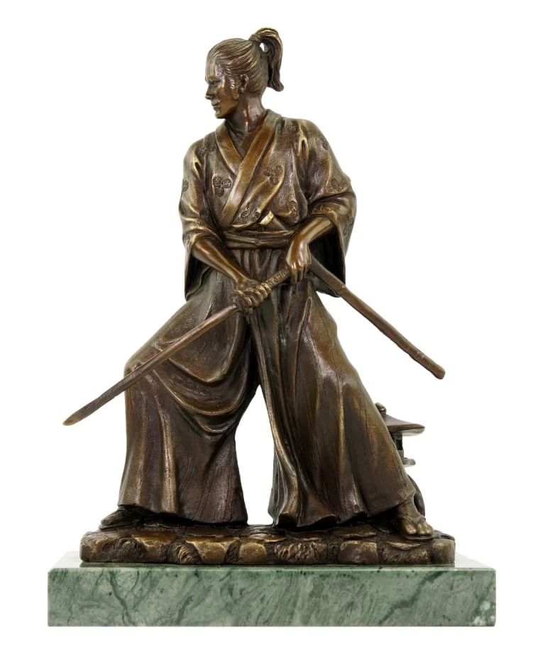 This exclusive bronze statue takes you back to traditional, pre-industrial Japan. The bronze sculpture, positioned on a decorative green marble base, depicts a samurai armed with a sword – a symbolic warrior who stands for fearlessness and strength beyond the borders of Japan. The extremely realistic and detailed representation is remarkable. Almost every tiny motif on the bronze statue seems to have been well thought out and is accordingly worked out with virtuosity. This is particularly visible in the area of the presented materials. Flowing fabrics meet smooth, soft skin as well as hard stone and metal. The samurai statue is limited to 20 pieces, consecutively numbered and bears the artist’s signature.