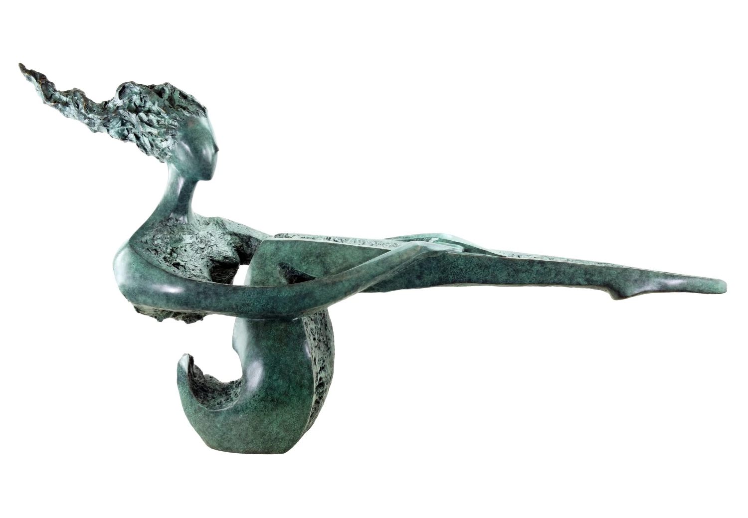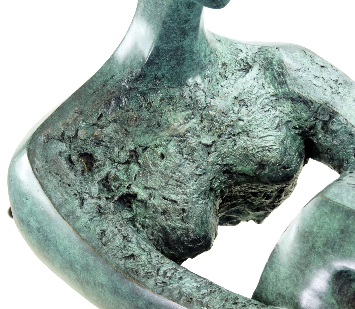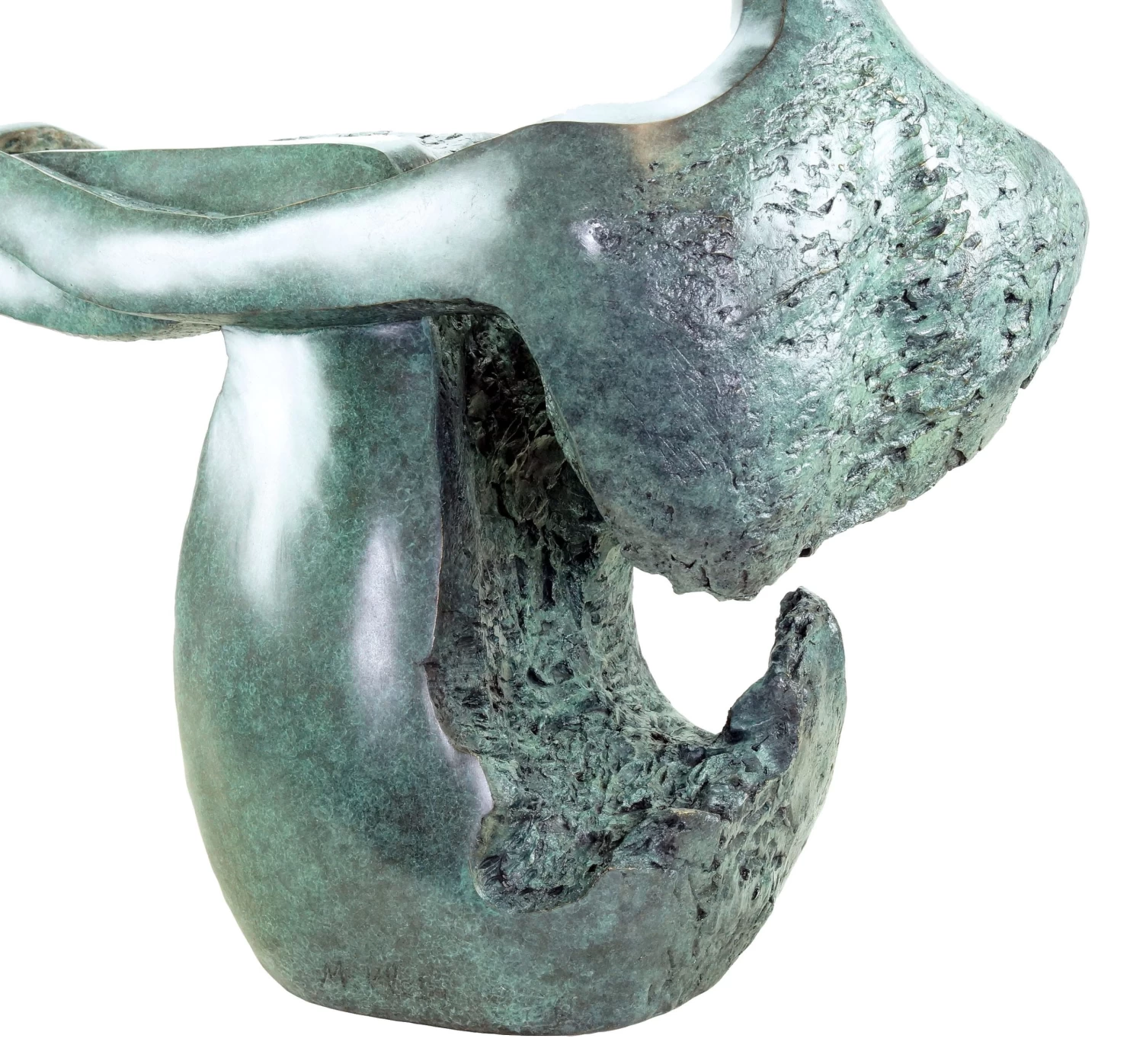 This opulent bronze statue by the artist Martin Klein depicts an abstract female nude that is characterised by its flowing shapes as well as its fragmentary representation. The freestanding sculpture has no base. The bottom of the abstract woman figurine serves as a direct connection to the ground. Thus, this extensive bronze statue seamlessly blends into its surroundings and can be used as a versatile decorative element. The limited bronze statue can be placed as a decorative figurine both in the interior as well as in the garden. The female figurine has a green patina, as it is made from 100% bronze. This means that it is weatherproof and thus makes for an excellent garden sculpture. The contemporary sculpture is exclusively limited to 20 pieces and serially numbered. It bears the signature of the artist und fits into a series of luxurious sculptures that Martin Klein has created over the past years. This particular female nude is a horizontally oriented motif that has a very captivating aura when it comes to spatial design. Due to its almost minimalistic design, the abstract large-scale sculpture is suited for making a statement in both private as well as public spaces.
