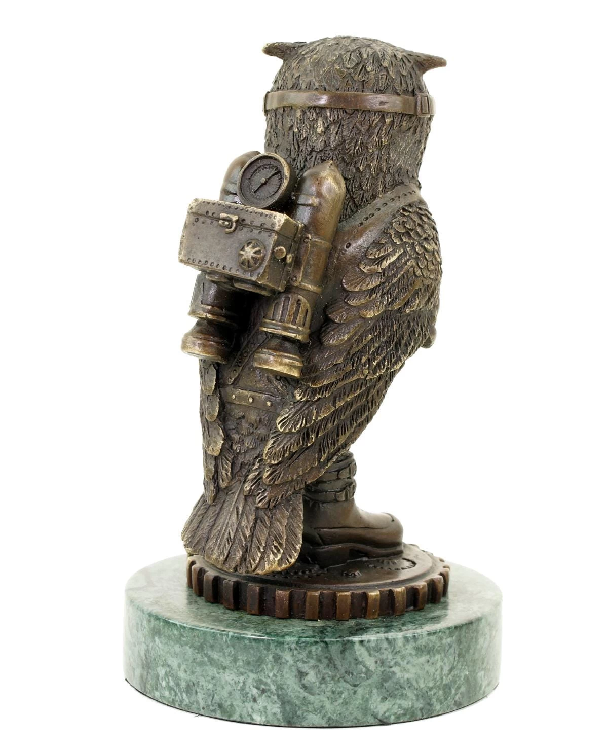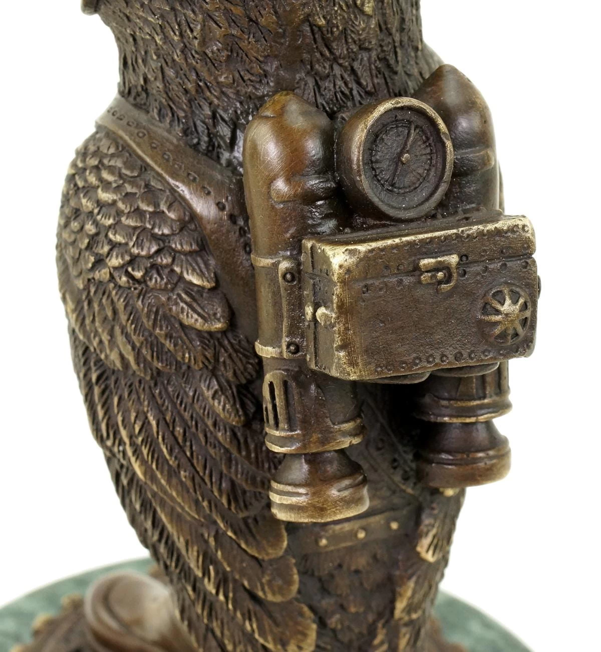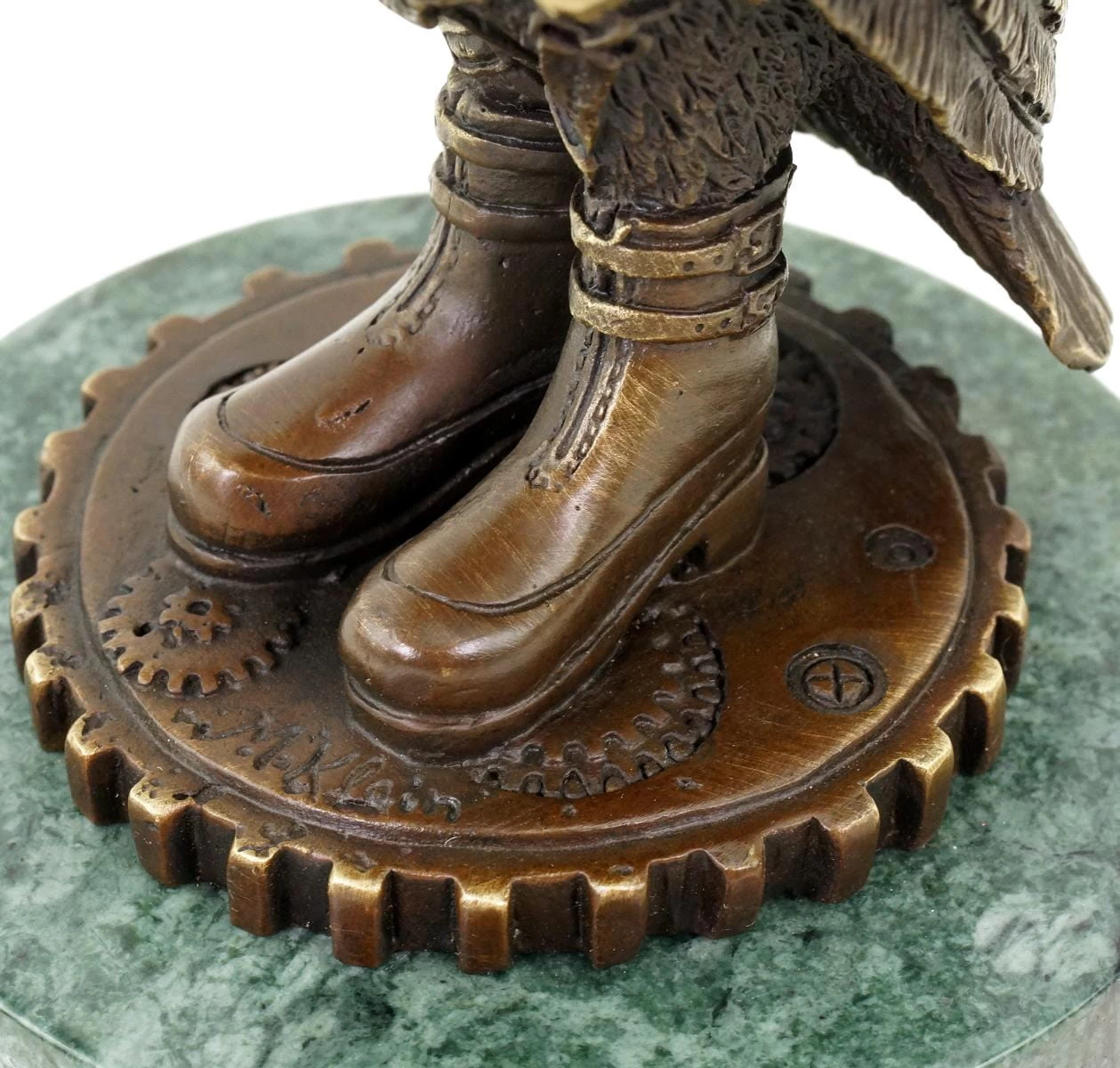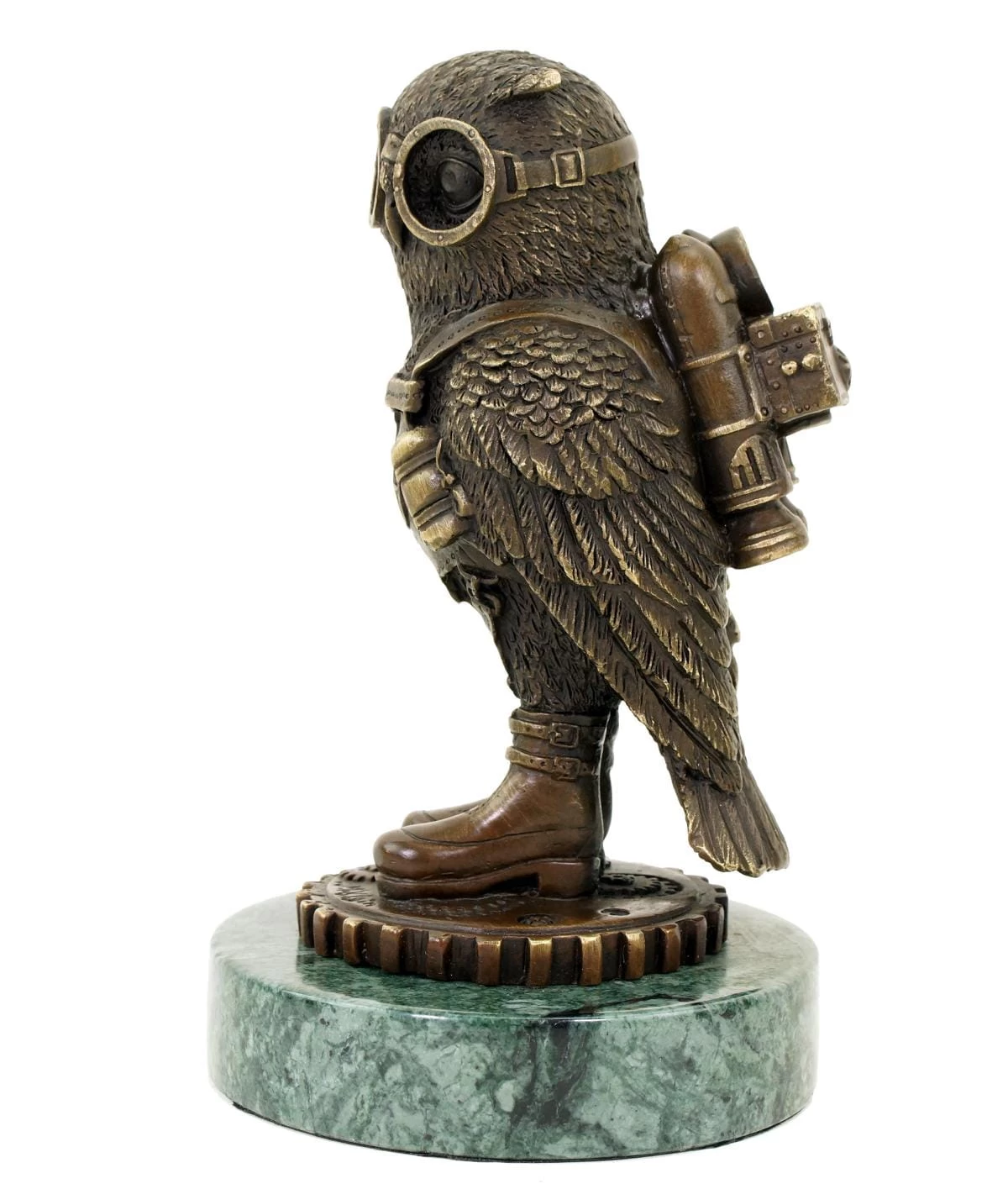 In this decorative bronze figurine, the artist Martin Klein once more combines a realistic motif with fictional steampunk elements. Thus, this owl on a green marble base is part of a series of bronze sculptures by Martin Klein that are part living being and part machine. In the case of this detailed animal figurine, an eagle owl is clad in pilot’s equipment, as if it is waiting for the start signal of its next flight. Additionally, the owl seems to intently look towards the observer. On its back, the small owl carries a rocket boost that rounds off this almost humorous motif. This steampunk figurine is made of 100% bronze and is characterised by many small details, which can only be discovered by a more thorough observation. Discover more steampunk sculptures by Martin Klein in Kunst & Ambiente’s Bronzeshop.