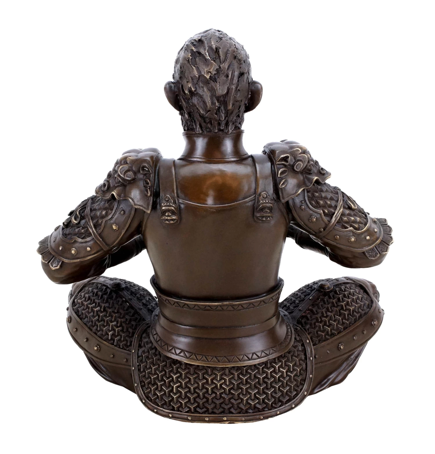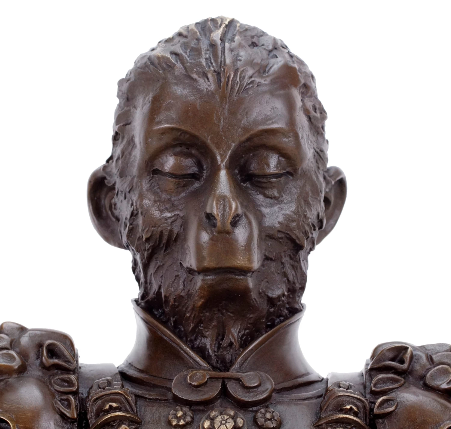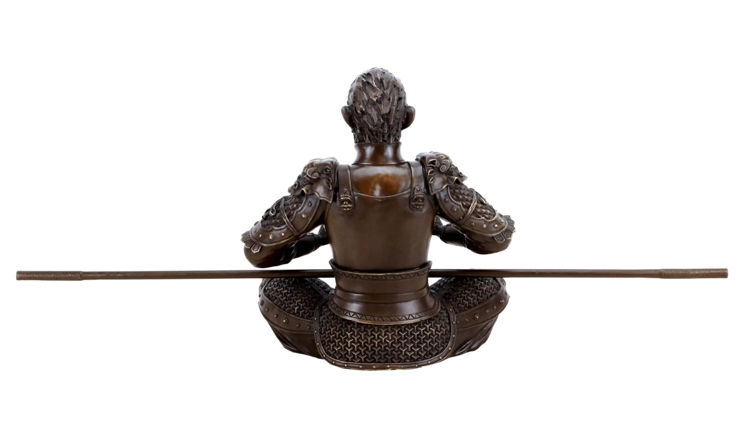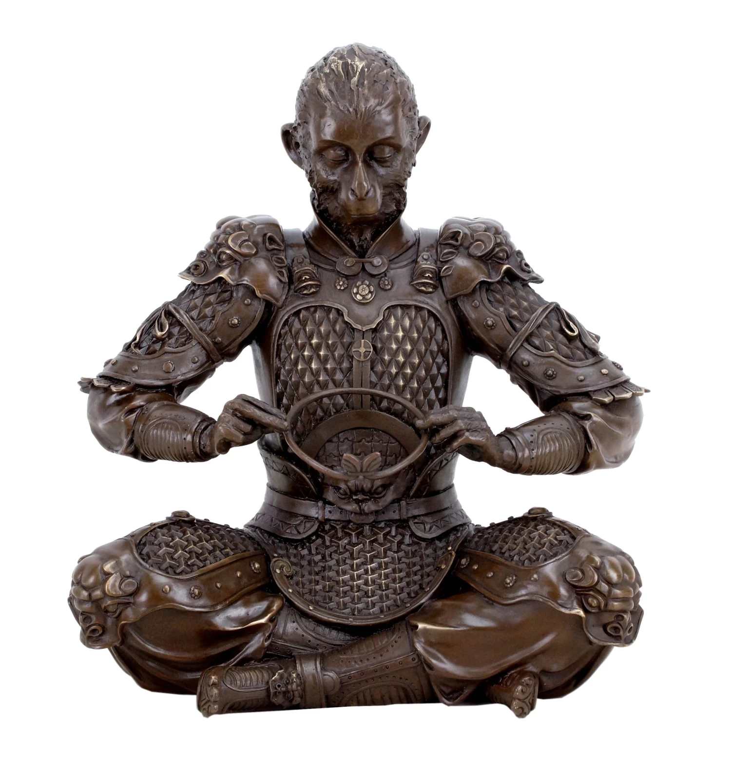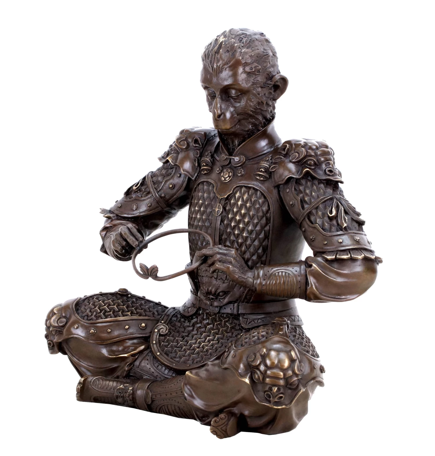 This bronze ape sculpture is a complex sculptural interpretation by a contemporary Chinese artist, who captured the character of the King of Apes into bronze. In this instance, Sun Wukong is depicted as a warrior. He wears a detailed armor with numerous embellishments and a crown on his head. In his lap lies his legendary staff, with which he is supposedly able to change his heigt at will. The staff can be removed from the figurine. This two-part bronze Sun Wukong warrior sculpture is slightly polished in certain areas in order to highlight some of the bronze sculpture’s features. Additionally, the freestanding figurine is equipped wit the signature of the artist.
