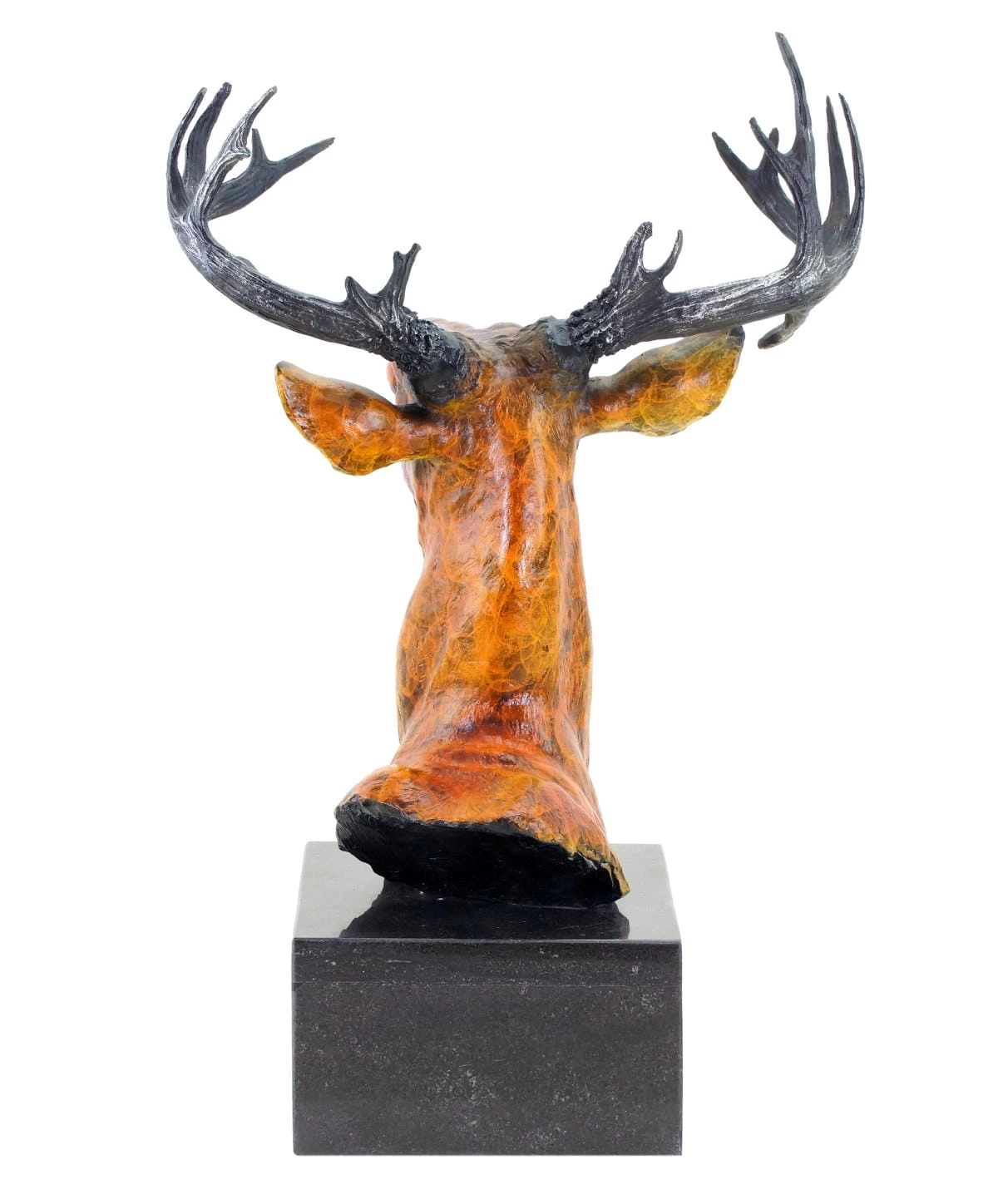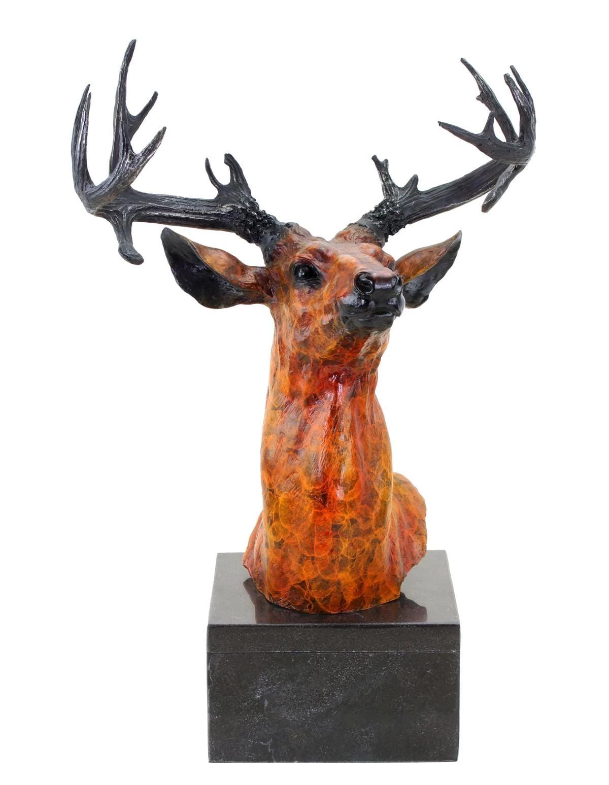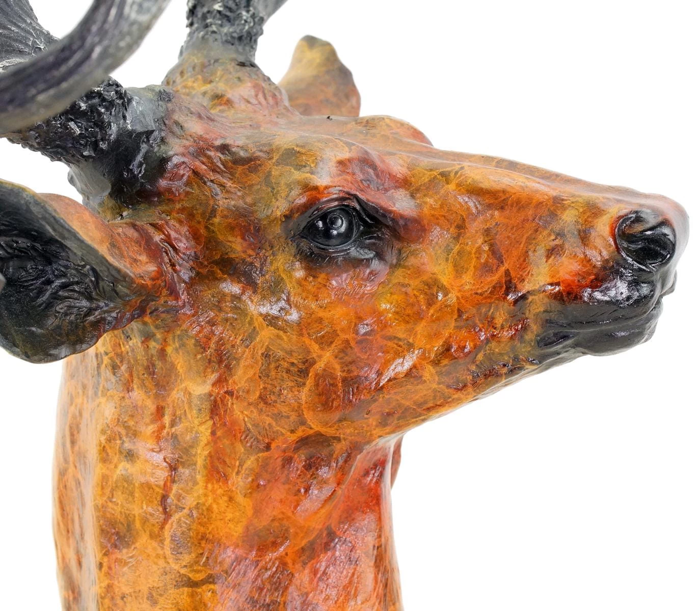 This decorative bronze statue is a very special hunting trophy. Placed on a discreet, black marble base, the signed bronze statue depicts the shape of a noble stag. The slightly abstracted stag bust is characterised by a very detailed design, which almost brings the stag head to life. A special stamp print patina in discreet red and brown tones creates a unique marbling that refines the bronze statue even more. The bronze bust, which is signed by Bonheur, is an homage to hunters and especially to the awareness of traditions that are a part of hunting. Bonheur’s bronze stag has an opulent, but not overwhelming size that enables a flexible room placement. Of course, this decorative figurine is especially suited for surroundings that are coined by hunting traditions, such as a cosy fireside lounge or hunting room.
