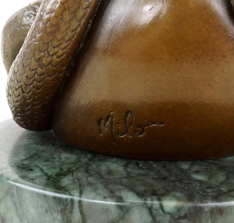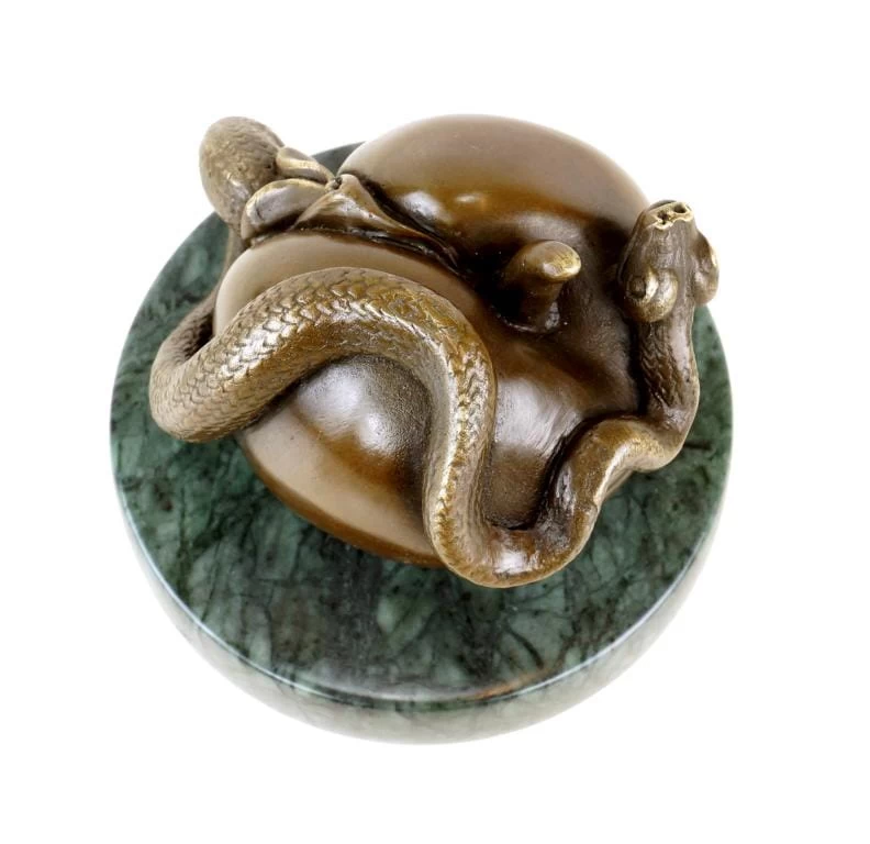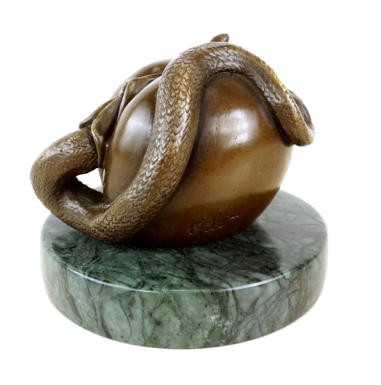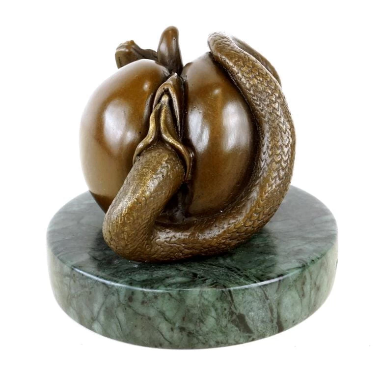 The biblical story about the fall of man and the subsequent expulsion from paradise is many centuries old, yet it still contains rather contemporary aspects that still inspire today’s artists. In the case of his erotic bronze figurine The Forbidden Fruit, the artist Milo focused on the aspect of seduction. This piece is a sort of vagina relief that the artist turned into the shape of an apple. An opulent serpent leaks out of this bronze vagina apple and entangles the fruit. The bronze figurine skilfully combines eroticism with symbolic elements of the Christian belief, and thereby creates a fascinating small bronze statue. The Forbidden Fruit by Milo is placed on a discreet green marble base and is embellished with the signature of the artist.