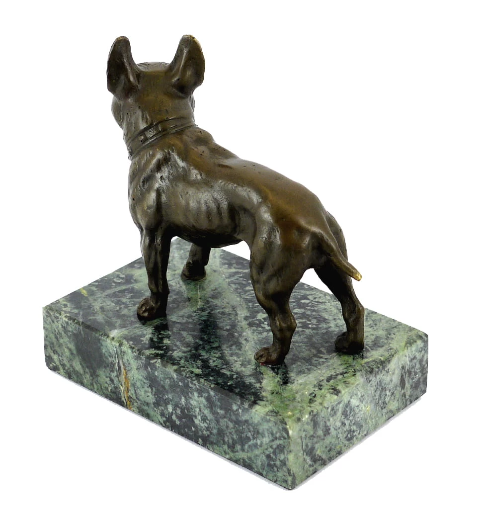 The little “Bulldog” mountedon green marble, is a high quality home accessory for people fond of small-sized animal sculptures. The Bulldog is a so-called “Vienna bronze“, the original of it was cast in the famous Bergmann foundry. The Vienna Bronze foundries have been in existence since 1850. Franz Bergmann, the original owner, designed countless bronze figures. The figure on the left is hallmarked with the Bergmann-stamp. The faithful execution of this dog looks wonderful for both indoors and outdoors and can be very suitable as a gift.
