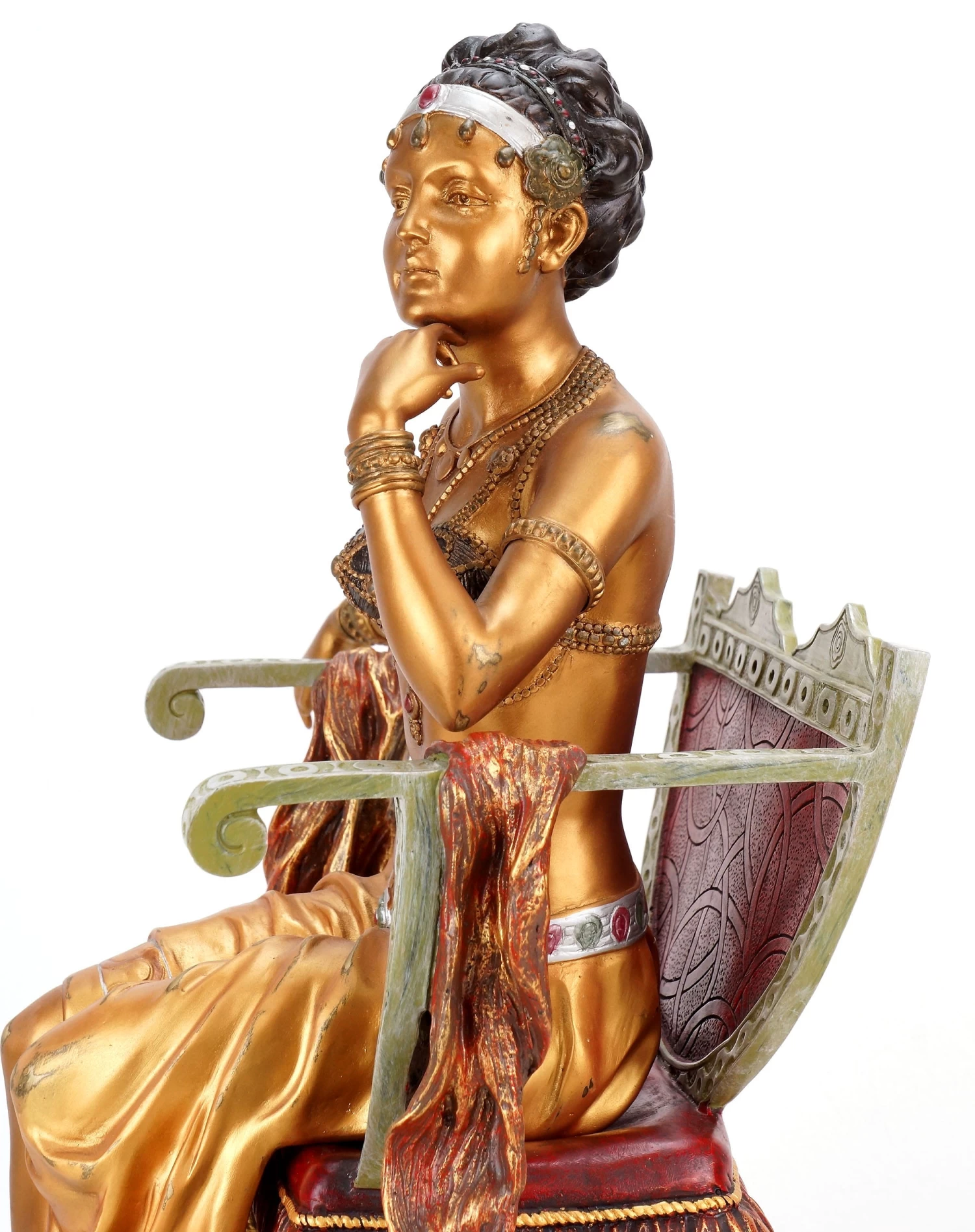 This tall Vienna Bronze skilfully bridges the gap between eroticism and statuary art. The two-piece figurine depicts a beautiful, young Arabian woman who gracefully positioned herself on a chair. This Arabian beauty has been completely painted by hand. The dominant golden hues represent both opulence and elegance at the same time. They are in contrast to a natural, authentic surface structure that lets the young woman come to life. Numerous applications and details correspond to the charm of the Orient, which heavily influenced the art works of the more than 80 Viennese bronze manufactories at the beginning of the 20th century. This sculpture is serially numbered and a limited offer.