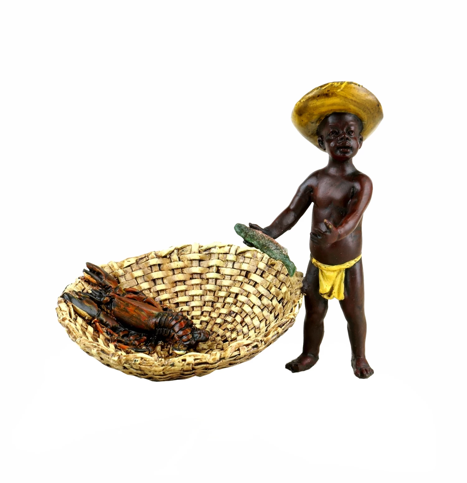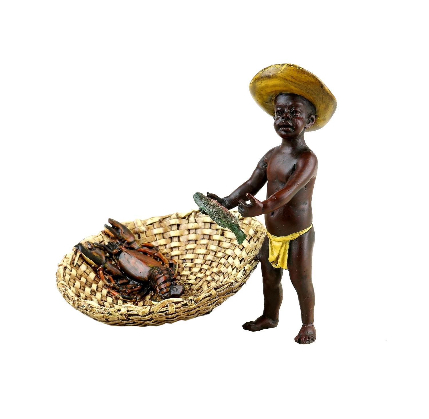 Originating from the missionary work in faraway lands, numerous exotic influences made their way to Europe during the 19th century. Those influences were extremely fascinating for the people in Central Europe and were therefore also replicated in the arts. A lot of Vienna Bronze pieces were created in the context of this exotic art discourse. Thematically, the bronze manufactories focussed on the depiction of dark-skinned children, the so-called blackamoors, which were shown performing tasks of everyday life. One could say that they created a whole miniature world full of musicians, bands, social games and dancing couples. Among the most famous motifs of this category are the works Blackamoor Band, Blackamoor Couple at Coffee Table, Dancing Blackamoor Couple and the figurine Blackamoor Musicians. The Vienna Bronze figurine that is depicted here shows a little blackamoor boy who is trying to fish. His efforts seem to have paid off, as there is a big lobster in his basket. The detailed blackamoor figurine of the litte fisher boy has been lovingly painted by hand and endowed with the Bergmann stamp.