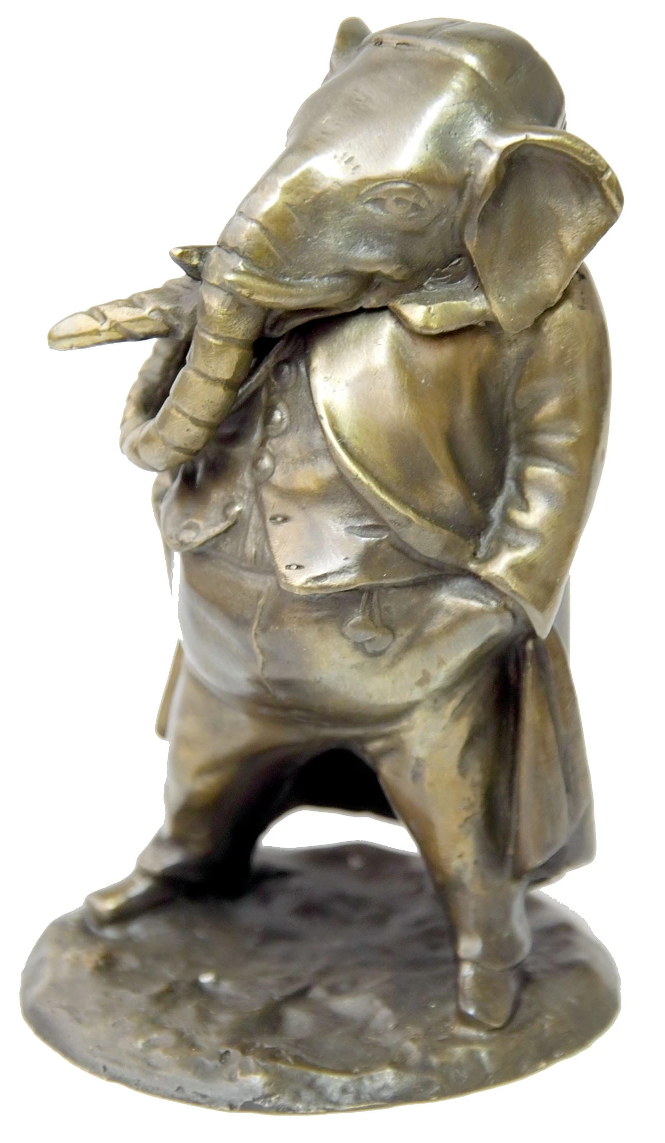 This Vienna Bronze figure is made using only the finest bronze, making it a marvelous work of art down to the smallest detail. Being an unconventional match holder in the shape of a dressed up elephant, this sculpture is an exquisite addition to any dining table. The elephant is standing upright on two legs and dressed like a gentleman. This match holder is a lovely accessory and a highlight in every collection. This animal cast was designed by Stevens F. – a designer of countless beautiful Vienna bronze figures.