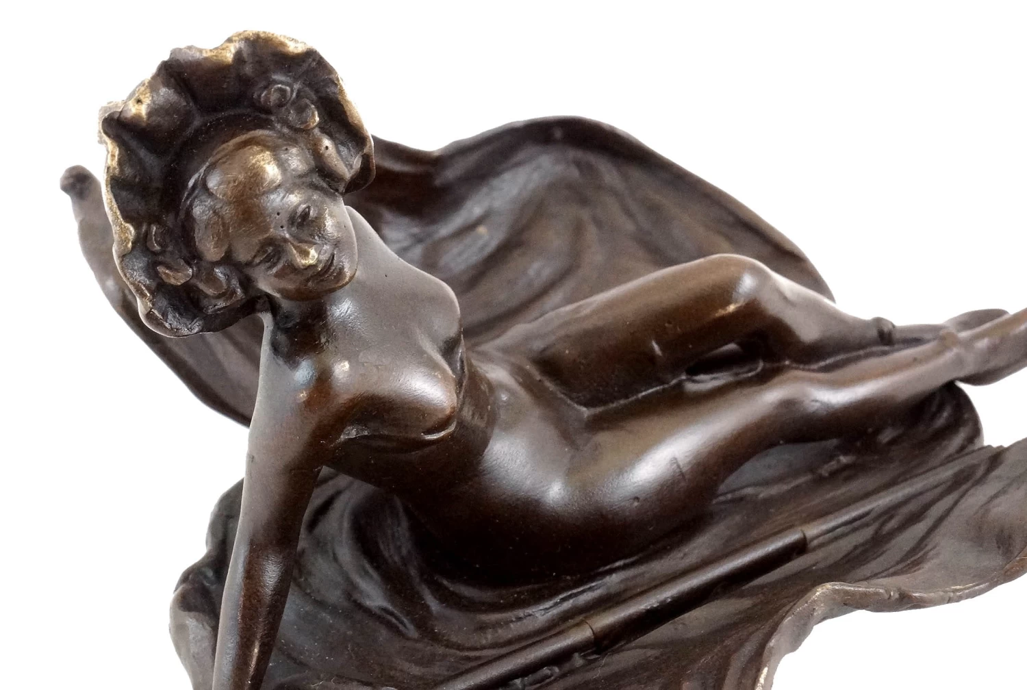 This mechanical bronze figure originates from the heyday of the Vienna bronzes. Shown is a young girl wrapped in a blanket consisting of two parts, which can both be opened to show a wonderful nude posture of the young girl. For lovers of erotic art, this sculpture is a big eye-catcher and would stand-out in every bronze collection.