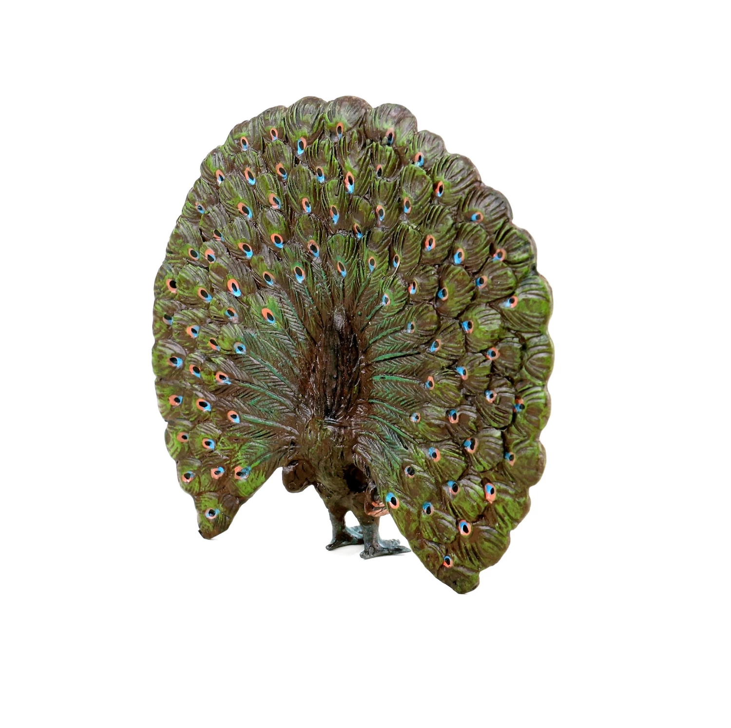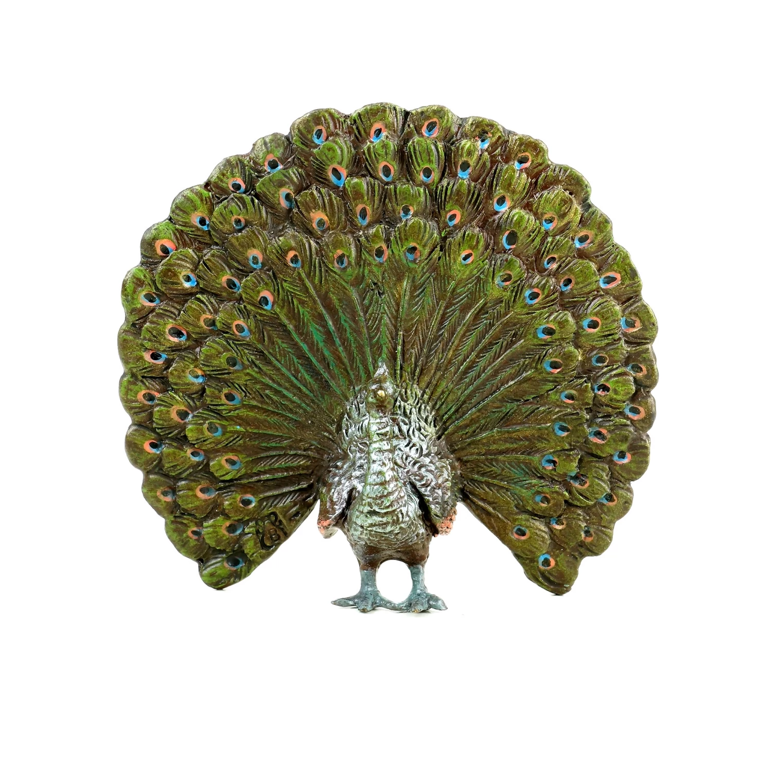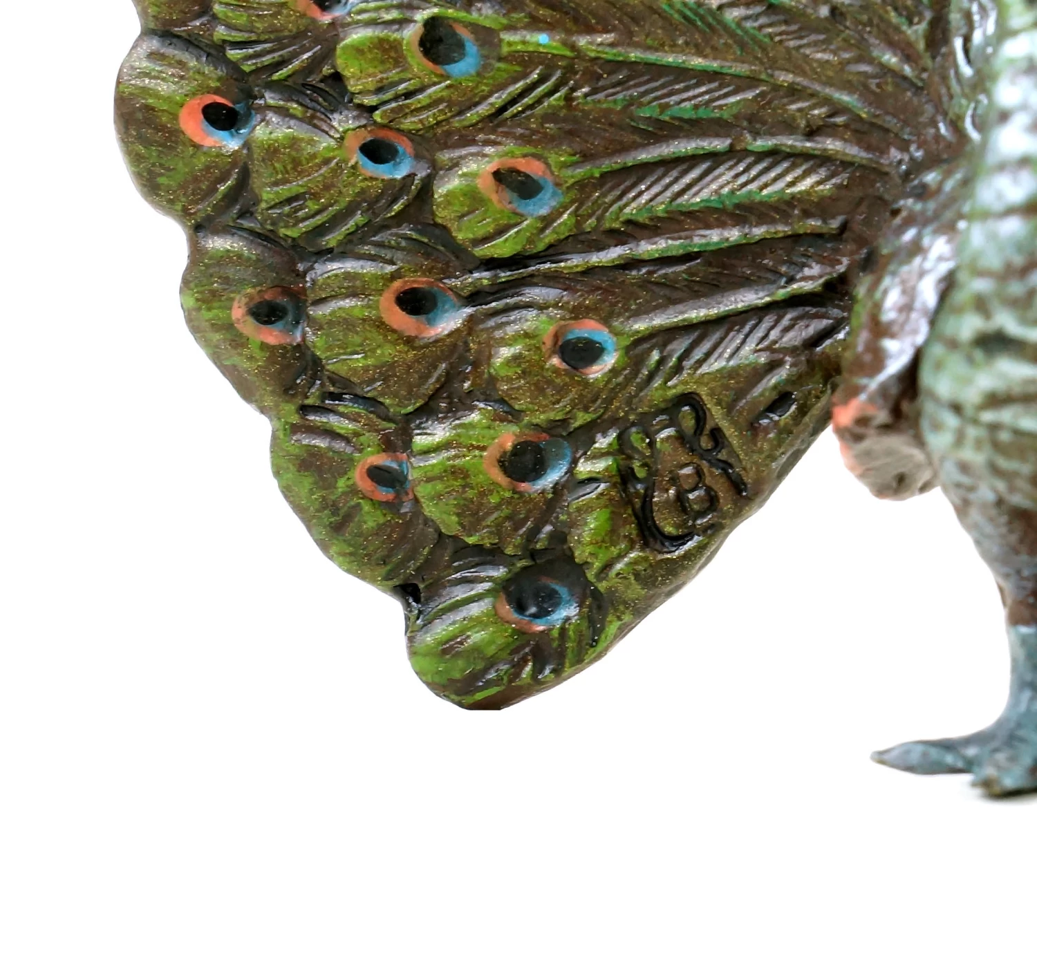 Authentic depictions of animals in the way of hand-painted miniature bronzes were in great demand at the more than 80 Viennese bronze manufactories at the end of the 19th century. The main trademarks of those small animal figurines from the Vienna Bronze period are their lifelike design and the fact that they have been painted by hand. Naturally, every little detail of this Vienna Bronze peacock is also hand-painted. The numerous “eyes” on the front and the back of the peacock’s feathers have been applied one by one, which gives this small bronze figurine a special touch, additionally to its detailed surface structure.