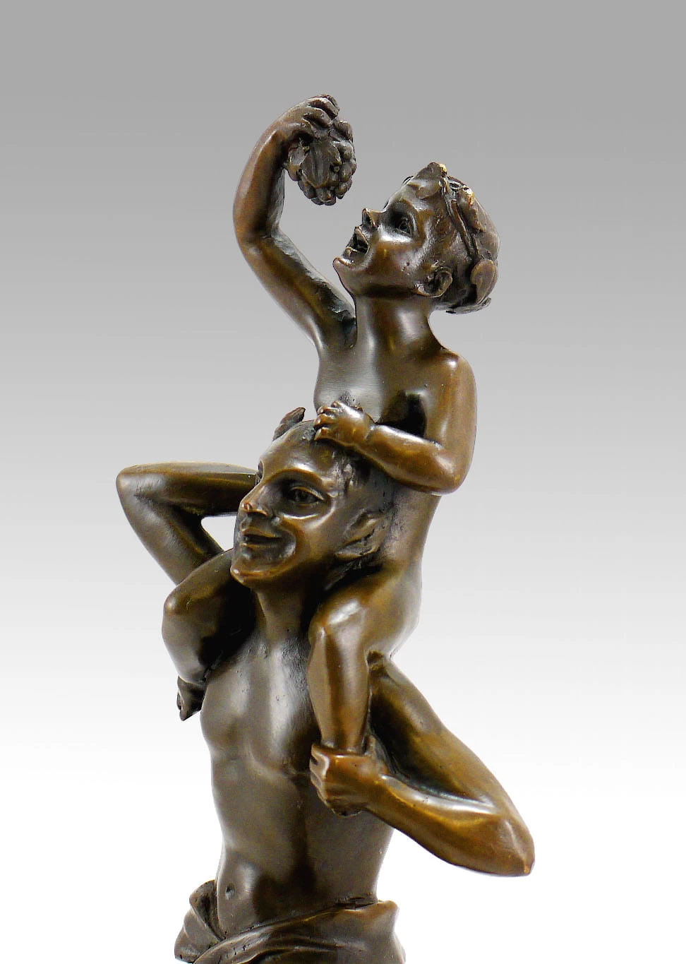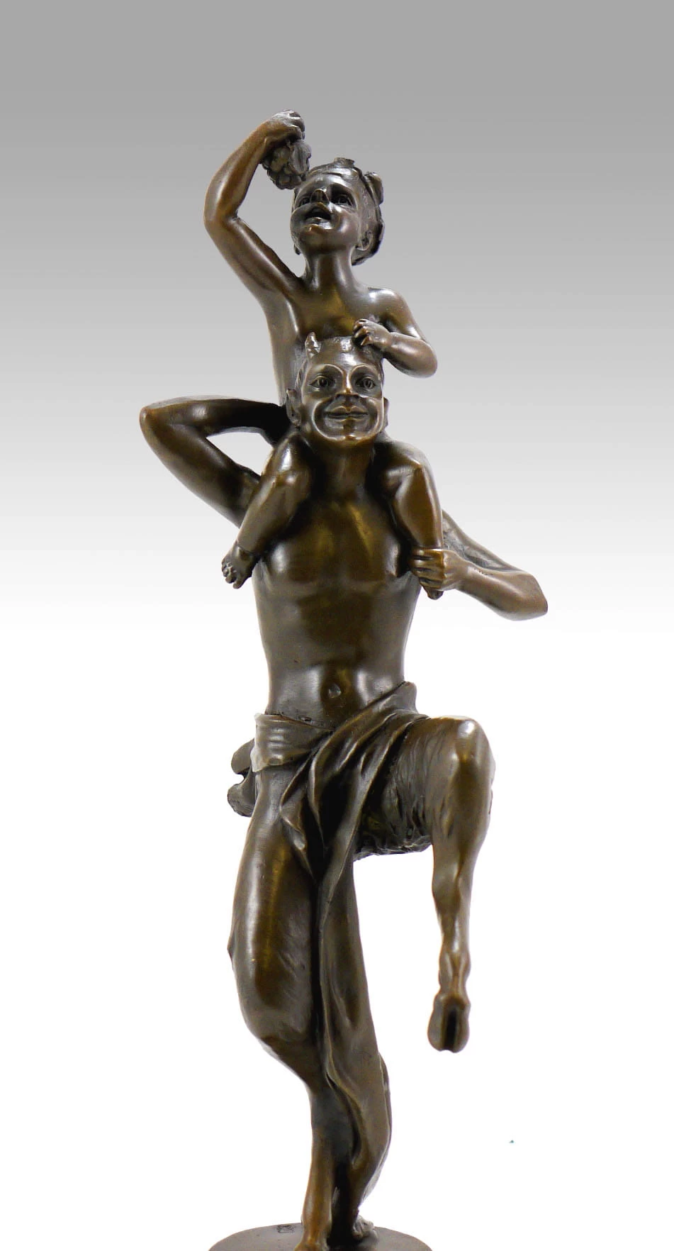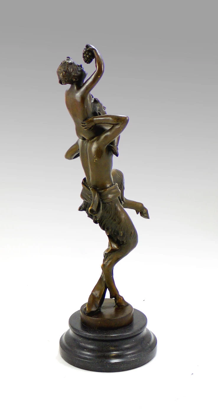 What a beautiful bronze figure, a wonderful piece of Art Deco Vienna Bronze displaying a Satyr with a baby, sitting on his shoulders eating grapes. This sculpture is affixed onto a fragment of a well-shaped marble base and can be used as a great showpiece for admirers of Art Deco and Vienna Bronzes. On the base of the sculpture, the artist Franz Bergmann, signed it with the stamp of his foundry giving this product a great finishing touch. It is a truly detailed museum bronze cast and focal point in every exhibition, in addition it is also an absolute eye-catcher for lovers of bronze sculptures, Art Deco or Vienna Bronze collectors and fans of satyr bronze figures.