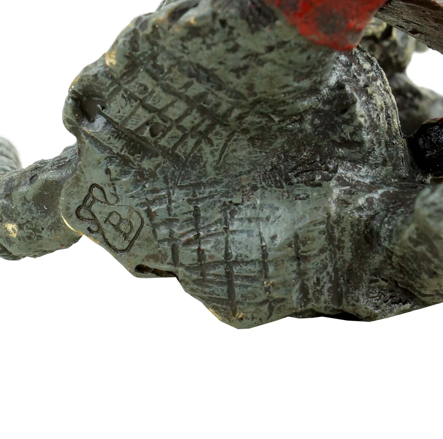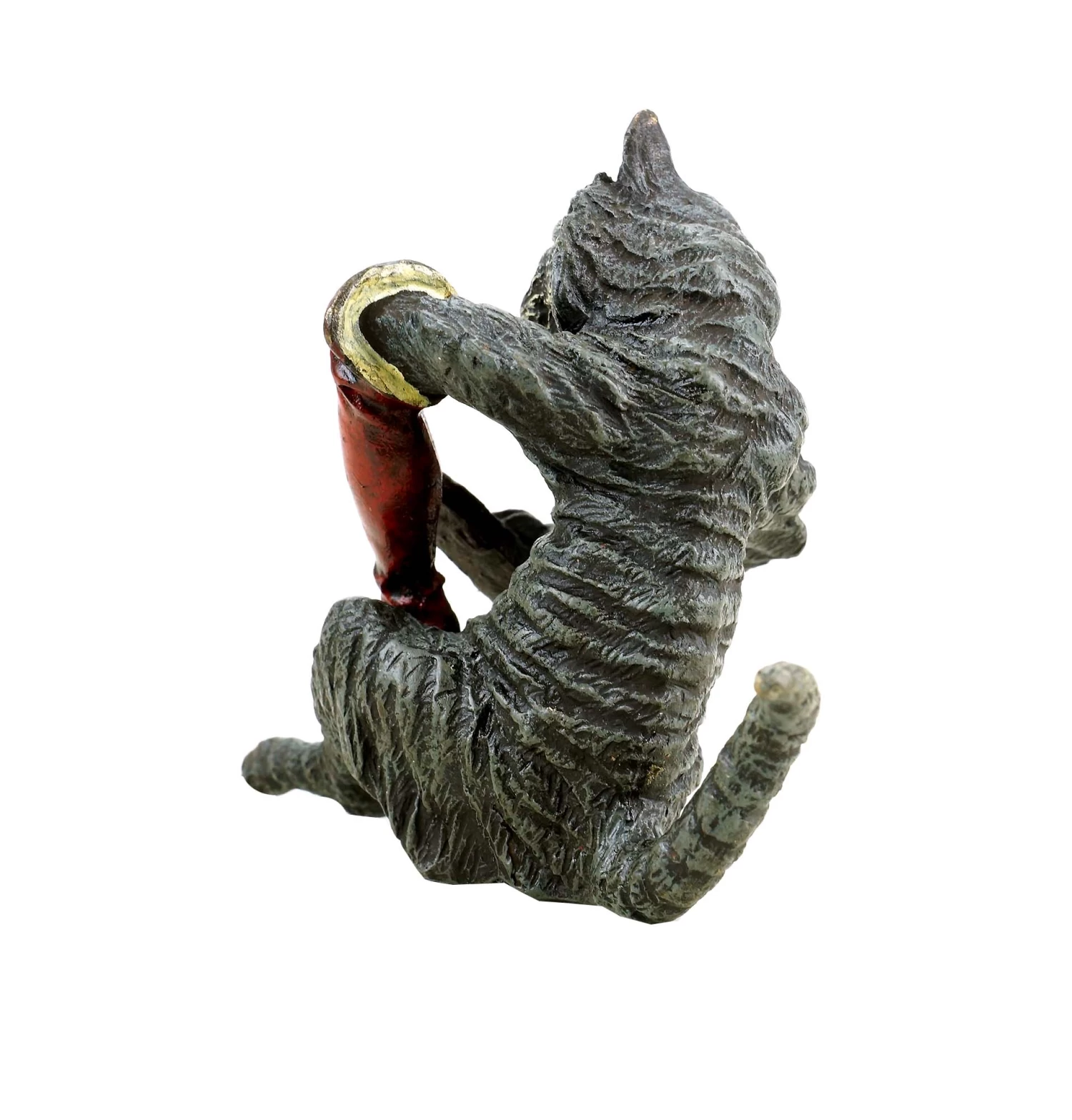 This fairy-tale Vienna Bronze figurine tells the story of a little cat that meticulously polishes its opulent red boots. This miniature bronze has been painted by hand and stamped with the Bergmann stamp. As far as animal depictions go, cats have always been a specialty of the Viennese bronze manufactories. Especially at the beginning of the 20th century, humanised portrayals of animals like cats, dogs, pigs and frogs that showed those animals in situations of human everyday life became popular decorative objects that are still treasured by collectors today. Stories like a cat and mouse enjoying some tea or coffee, or them making music together is no rarity. Almost any constellation of figurines imaginable has been created, which led to the production of numerous humanised animal figurines during the Vienna Bronze period. The sources for these depictions of animals seemed to be romantic literary fairy tales. This is why this Vienna Bronze Puss in Boots is also a reminder of those narrations and stories.