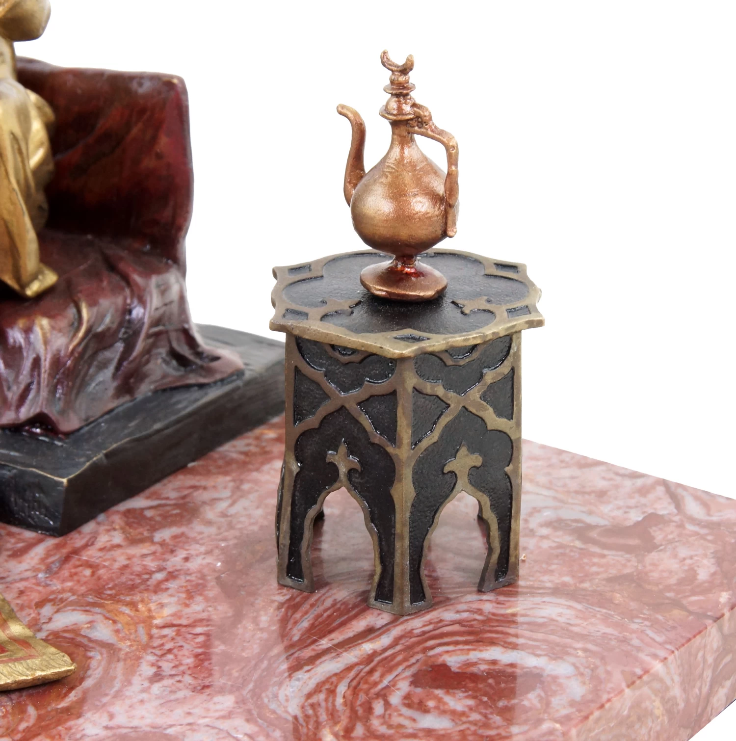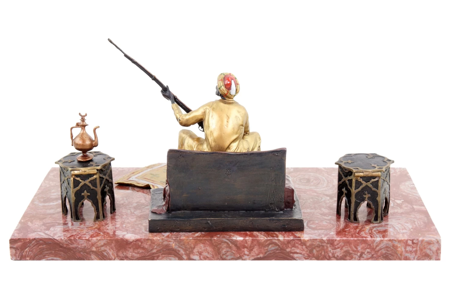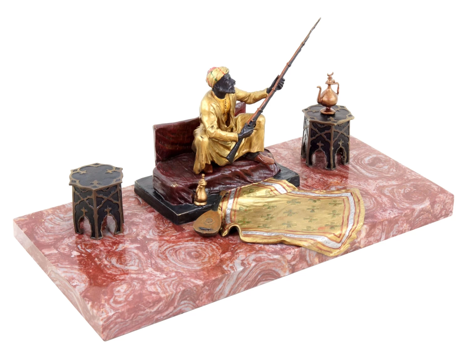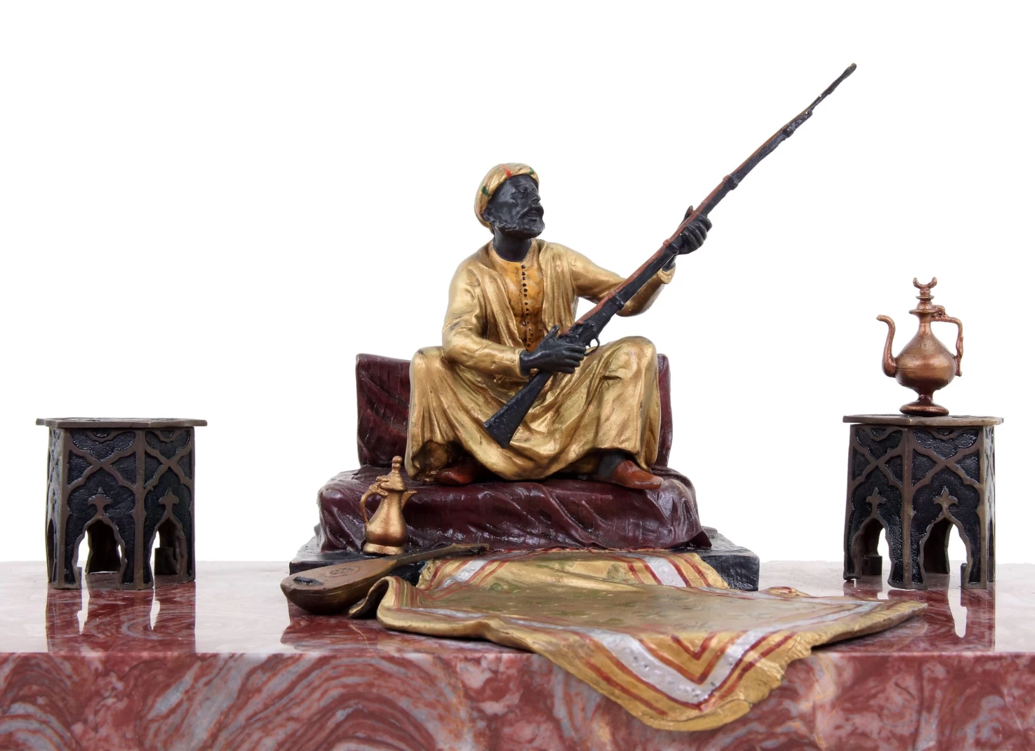 This Viennese bronze statue depicts an Arabian warrior who might be a member of a traditional Bedouin tribe. Placed on a red marble base, this Viennese bronze is mainly coloured in gold and brown hues. The Arabian warrior sits on a pillow, proudly holding his rifle in his hand. On the ground in front of him are a lute and an opulent golden carpet. The oriental scenario is framed by two small tables to the left and right of the Arab figurine on the marble base. Thus, this piece is not a carpet bronze in the traditional sense, like the thousands of others similar to it that were produced in Viennese bronze foundries. In this case, the carpet serves more as a playful part of the motif that is skilfully used to create a flowing transition between the bronze figurine and the marble base. The elegant Arab figurine was painted by hand and is equipped with the Bergmann stamp.
