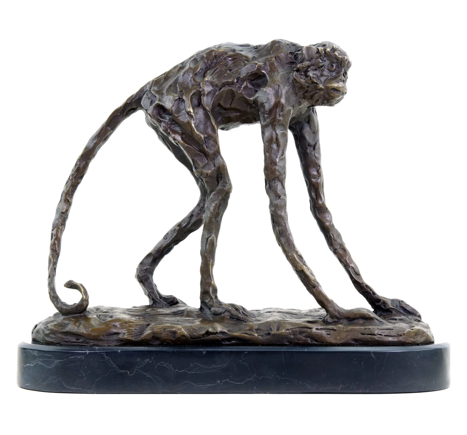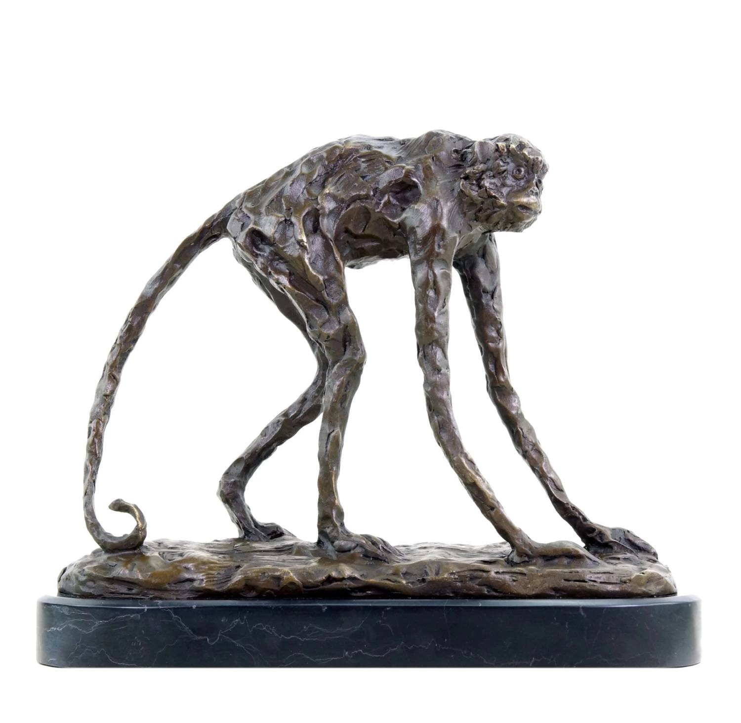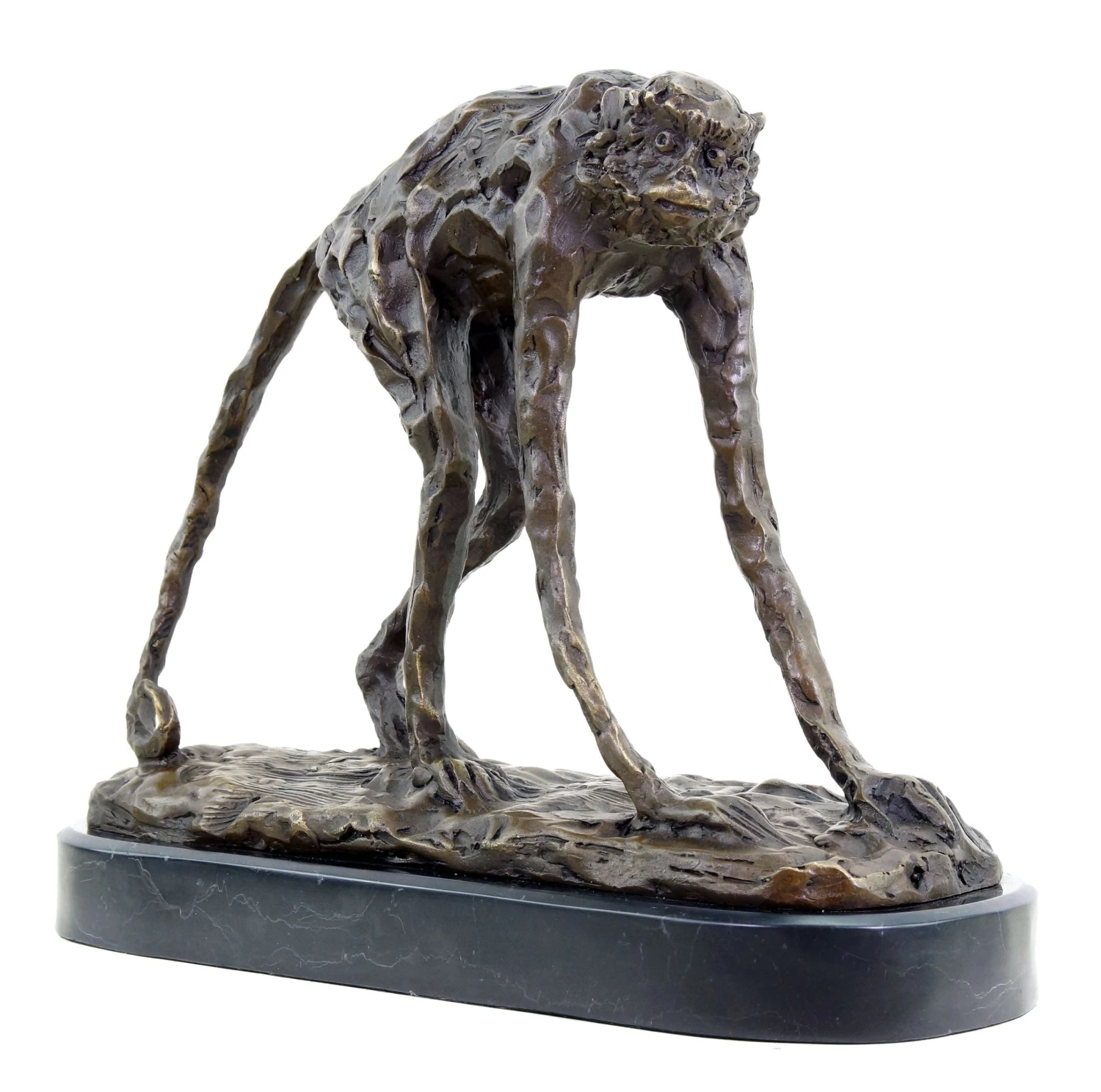 Sculptures by Rembrandt Bugatti are rated among the most important animal depictions of the early 20th century. Thus, this bronze ape figurine seamlessly fits into the artistic heritage of the Italian artist, whose works encompass more than 300 sculptures and statues. Placed on a discreet marble base, Bugatti’s Walking Ape is characterised by its authentic, slender bodily proportions, which are slightly abstracted by an almost crude surface design. This structure is typical for the unique style of the artist who spent most of his life in Paris. In this regard, some other works of his are Walking Panther and Elephant Begging. The decorative bronze ape figurine is accentuated by several polishings that skilfully highlight the valuable material.