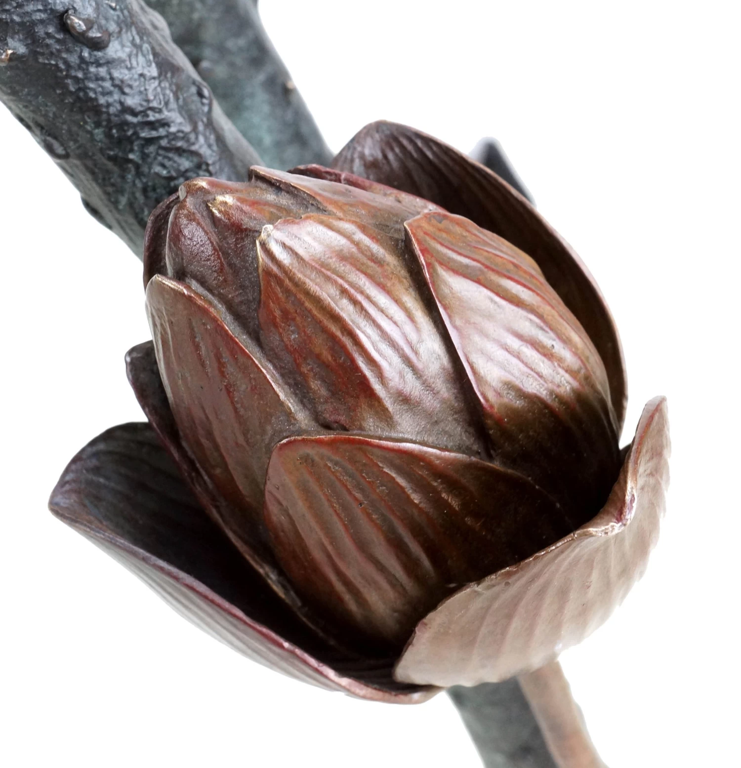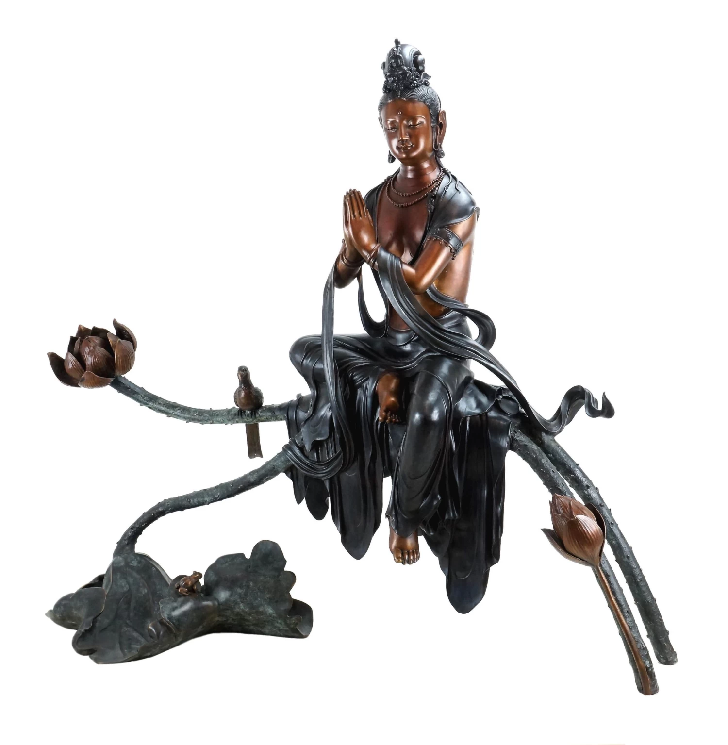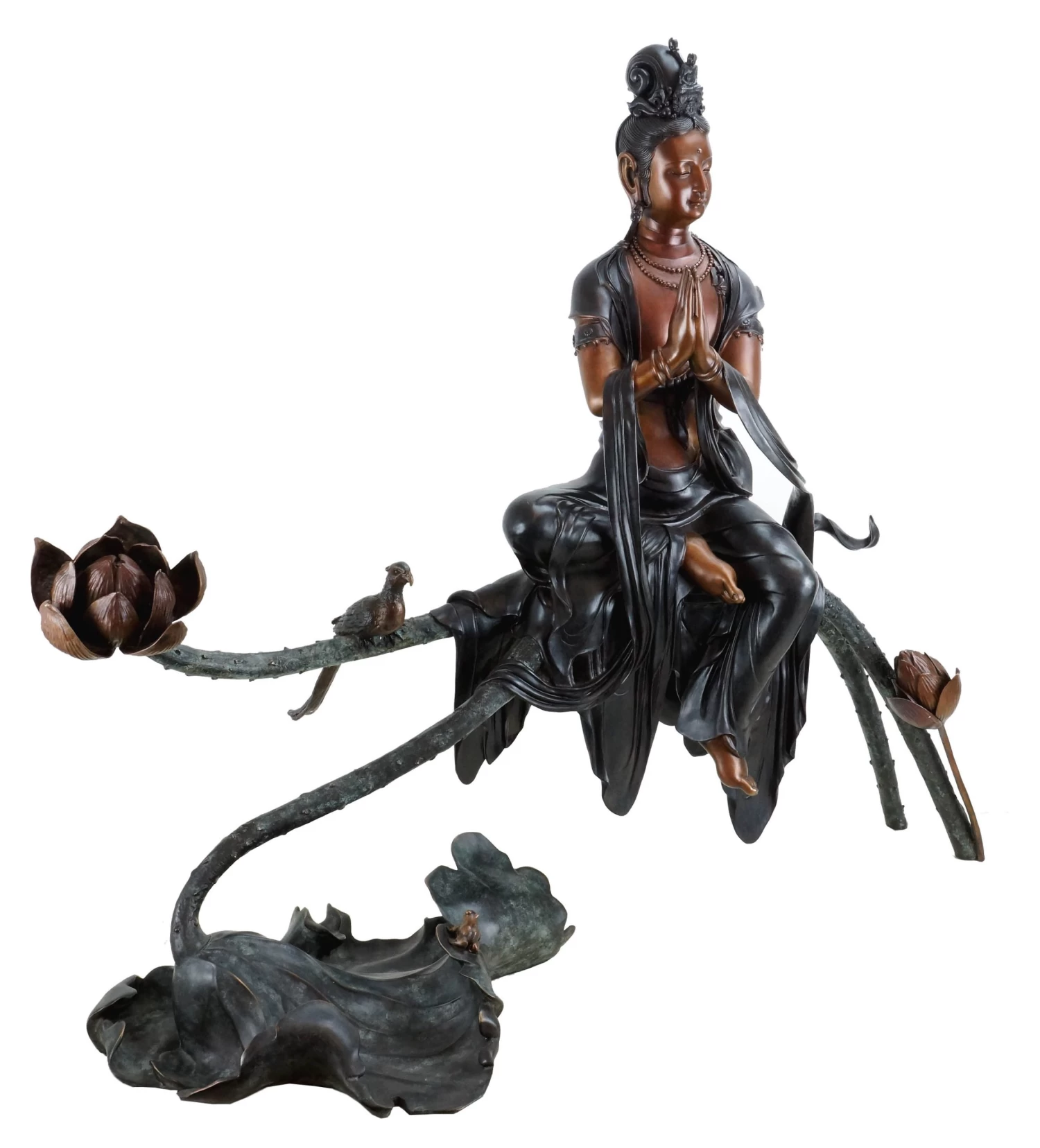 The White Tara by Milo is without a doubt one of the most complex figurines in the product range of Kunst & Ambiente’s Bronze Shop. The freestanding bronze statue is an hommage to the legendary figure of the White Tara, which plays an important role in Tibetan Buddhism in particular. Even though her form might be reminiscent of it, the White Tara is not a classic Buddha, but she belongs to the so-called enlightened beings that are known as Bodhisattva. The White Tara embodies the motif of complete purity and enlightenment. Those are ideals that play an important role in today’s meditation and yoga teachings. With this sculptural interpretation of the White Tara, the artist Milo depicts an opulent and at the same time delicate bronze sculpture that is characterised by its complexity. This bronze Buddha statue shows the White Tara dressed in flowing vestments, sitting on a branch in a classic yoga position. Surrounded by flowers, leaves and a bird, the yoga sculpture exudes an aura of endless tranquility, despite its complexity. The numerous details of the bronze statue are additionally highlighted by a partial patina, for example in the area of the skin and the flowers. The White Tara by Milo is a contemporary interpretation of a traditional motif that combines basic Buddhist ideals and still manages to keep its fingers on the pulse of time.