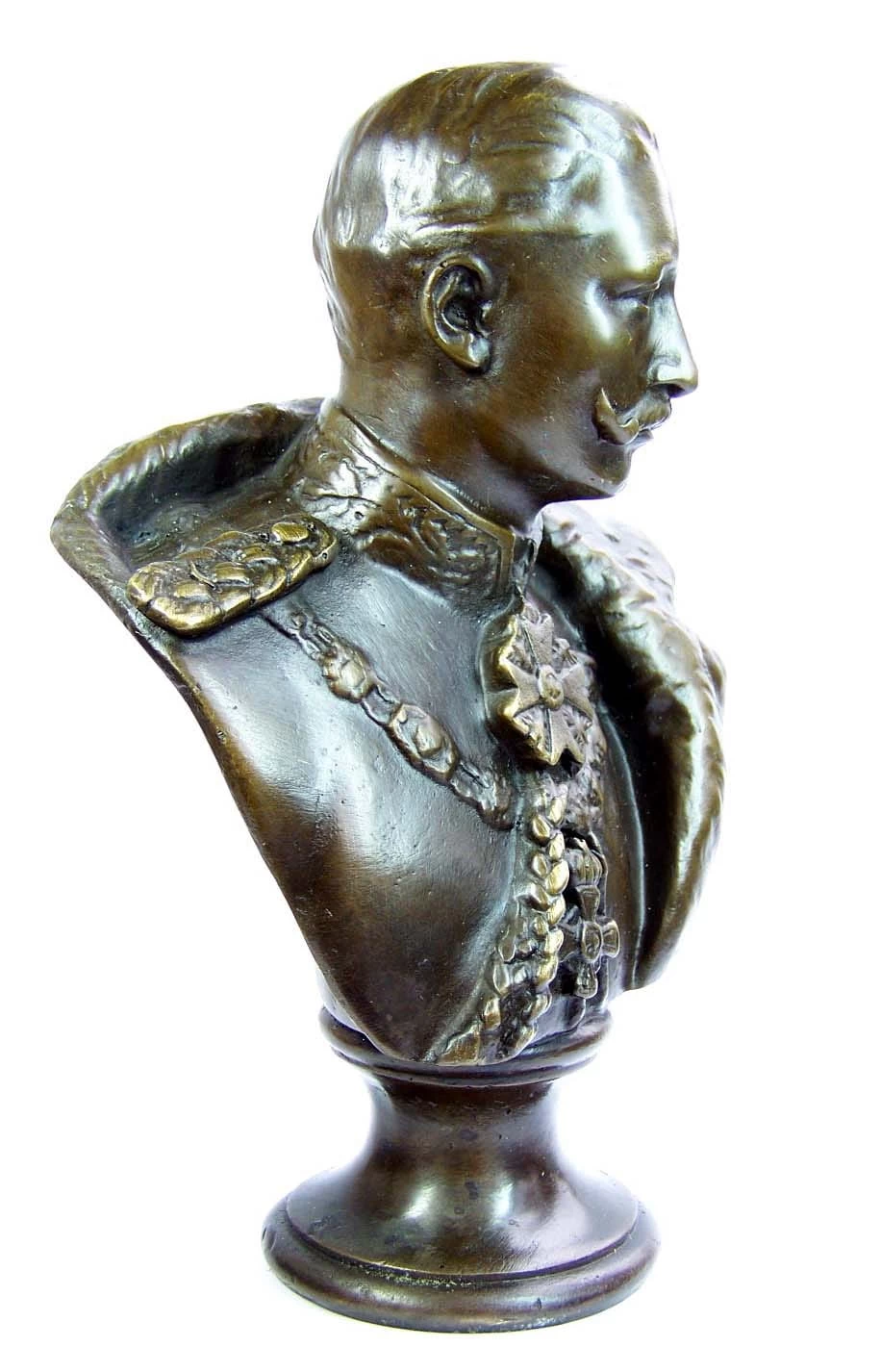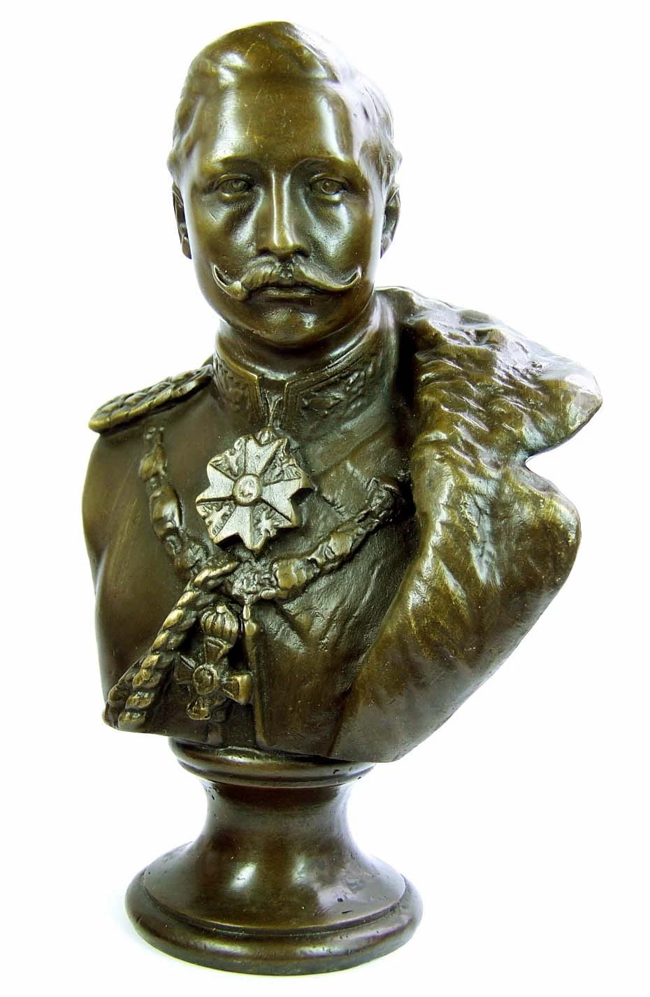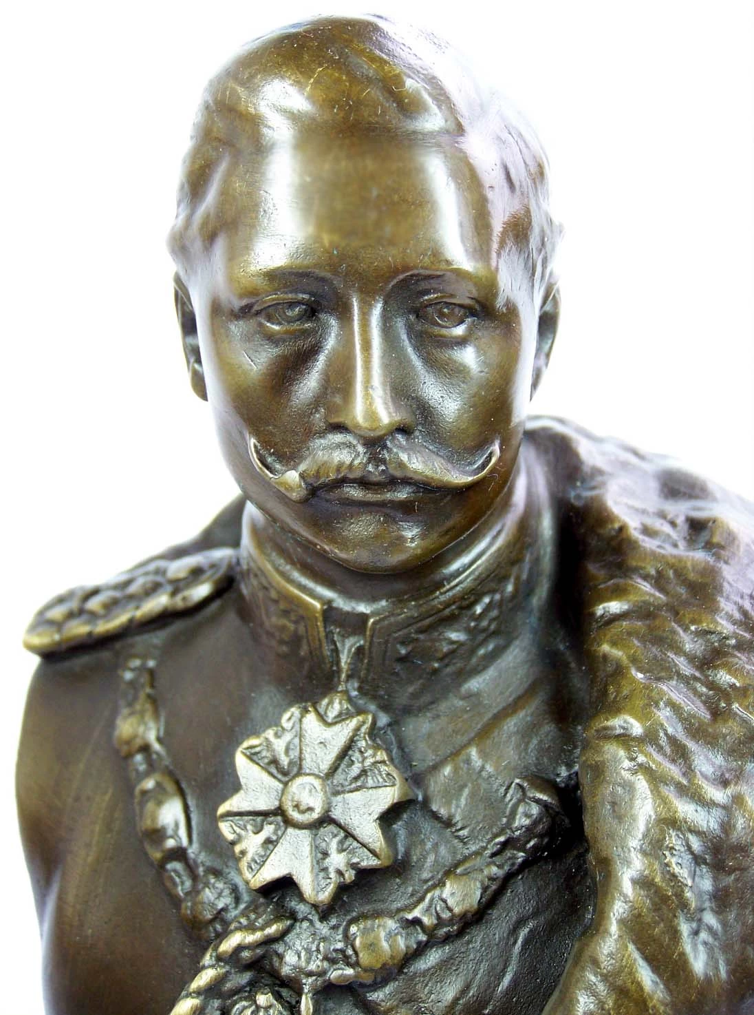This historical Military bronze bust shows the German Emperor William II., who reigned the country from 1888 to 1918. The special expression of his face seems very natural and is worked in detail. The King of Prussia and Emperor of the German Reich wears Prussian uniform clothes and a fur coat and is decorated with military medals. The sculpture is set on a special shaped bronze plinth, that is important for its stability. The Military bronze bust is made of 100% finest bronze and has a signature of its founder at the reverse side.